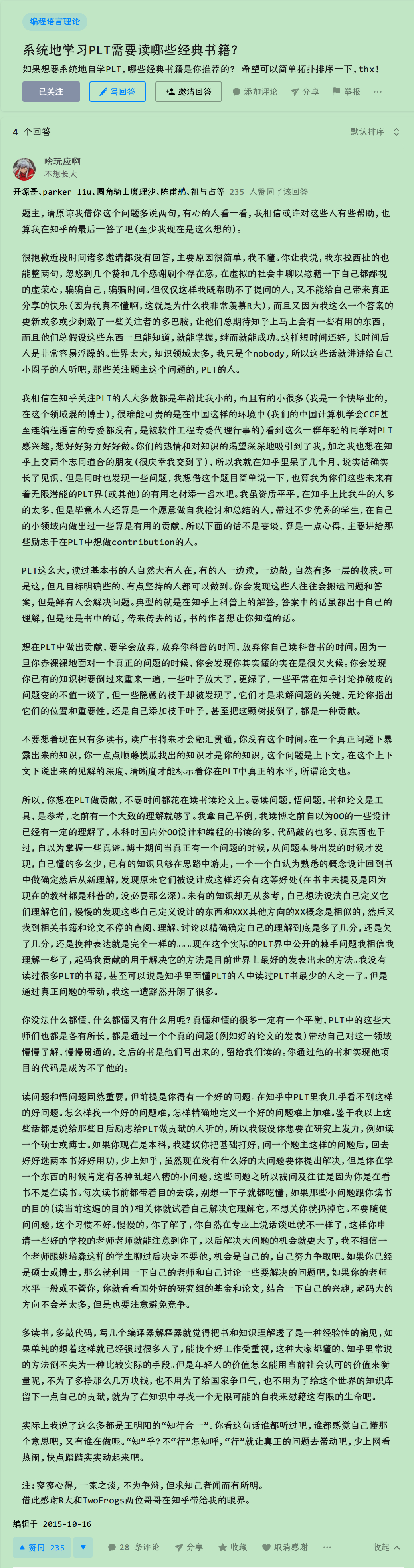 - 编程书我的原则是, 一定要整理出博客来, 一定要做至少5组的网络搜索(疑问也好, 探索性的好奇心也好, 都可以), 能试着写一点代码的就写一点, 写不了代码的就补一点注释.