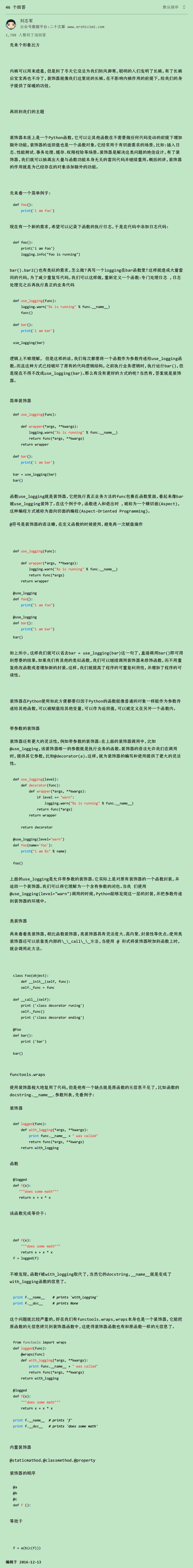 def decorator(func): def wrapper_who_return_funcPtr(): # 返回参数列表: `https://web.archive.org/web/20210512042121/https://www.cnblogs.com/snow-backup/p/11077917.html` # inspect库: `https://web.archive.org/web/20220605125226/https://docs.python.org/3/library/inspect.html` print('before {} works.'.format(decorator.__code__.co_varnames[0])) func() print('After {} works.'.format(decorator.__code__.co_varnames[0])) return wrapper_who_return_funcPtr