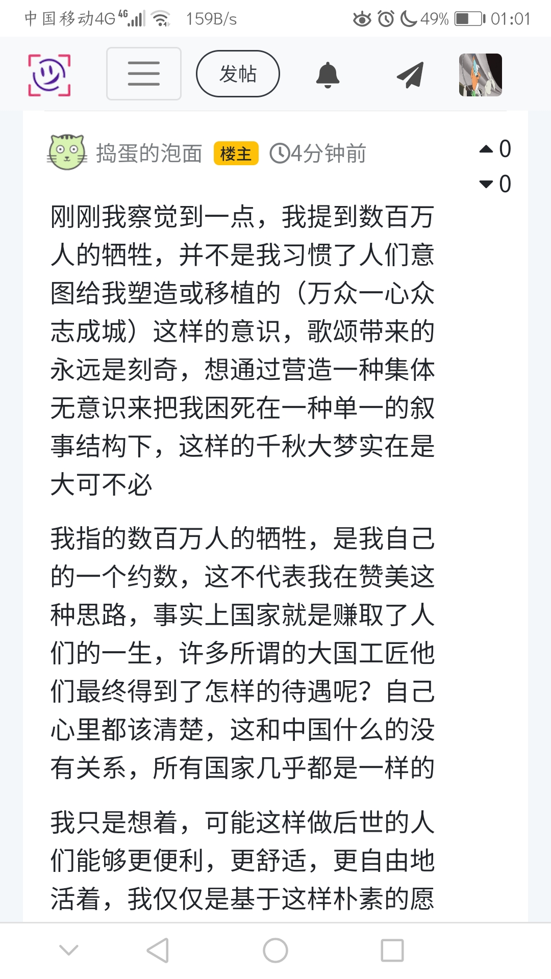 刚刚我察觉到一点,我提到数百万人的牺牲,并不是我习惯了人们意图给我塑造或移植的(万众一心众志成城)这样的意识,歌颂带来的永远是刻奇,想通过营造一种集体无意识来把我困死在一种单一的叙事结构下,这样的千秋大梦实在是大可不必