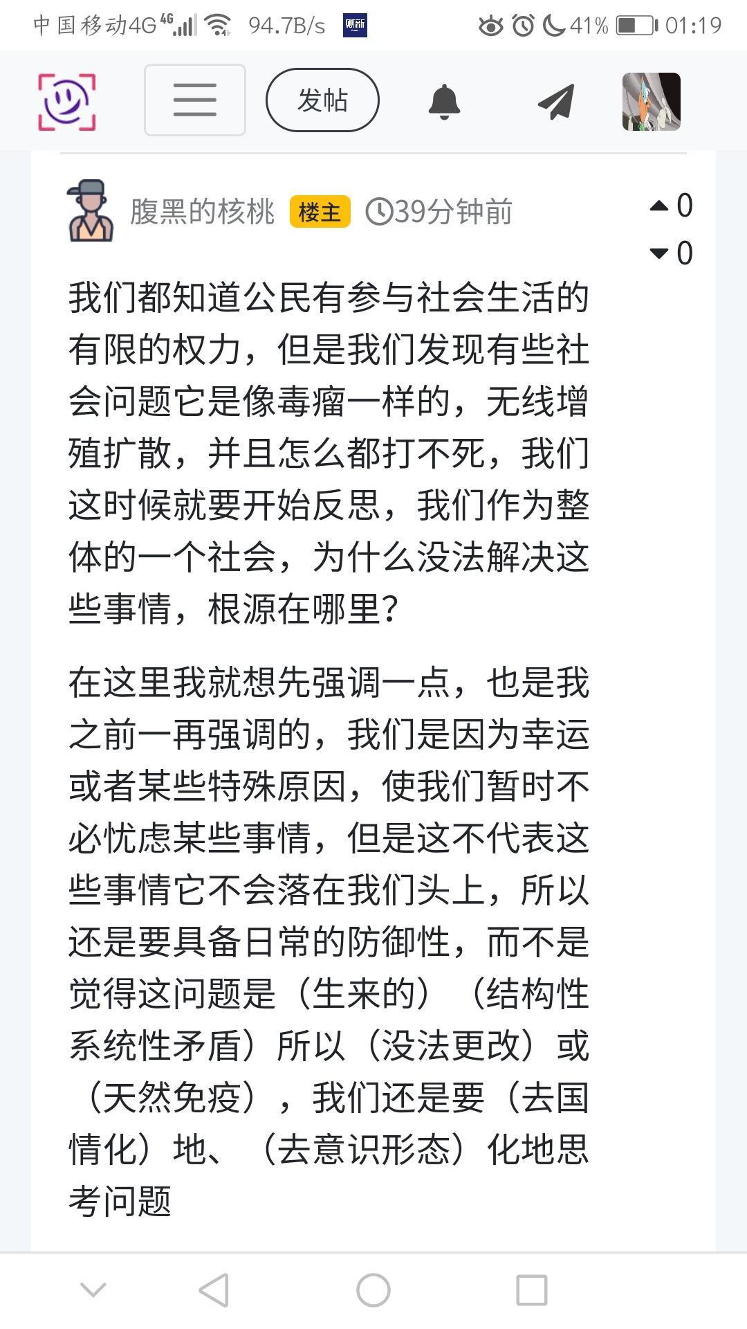 在这里我就想先强调一点,也是我之前一再强调的,我们是因为幸运或者某些特殊原因,使我们暂时不必忧虑某些事情,但是这不代表这些事情它不会落在我们头上,所以还是要具备日常的防御性,而不是觉得这问题是(生来的)(结构性系统性矛盾)所以(没法更改)或(天然免疫),我们还是要(去国情化)地、(去意识形态)化地思考问题