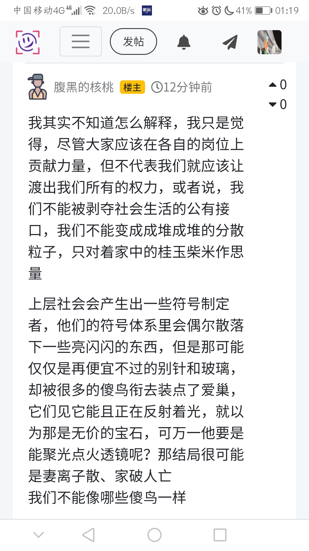 我其实不知道怎么解释,我只是觉得,尽管大家应该在各自的岗位上贡献力量,但不代表我们就应该让渡出我们所有的权力,或者说,我们不能被剥夺社会生活的公有接口,我们不能变成成堆成堆的分散粒子,只对着家中的桂玉柴米作思量