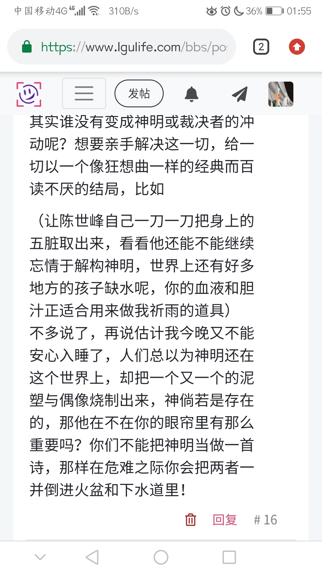 不多说了,再说估计我今晚又不能安心入睡了,人们总以为神明还在这个世界上,却把一个又一个的泥塑与偶像烧制出来,神倘若是存在的,那他在不在你的眼帘里有那么重要吗?你们不能把神明当做一首诗,那样在危难之际你会把两者一并倒进火盆和下水道里!