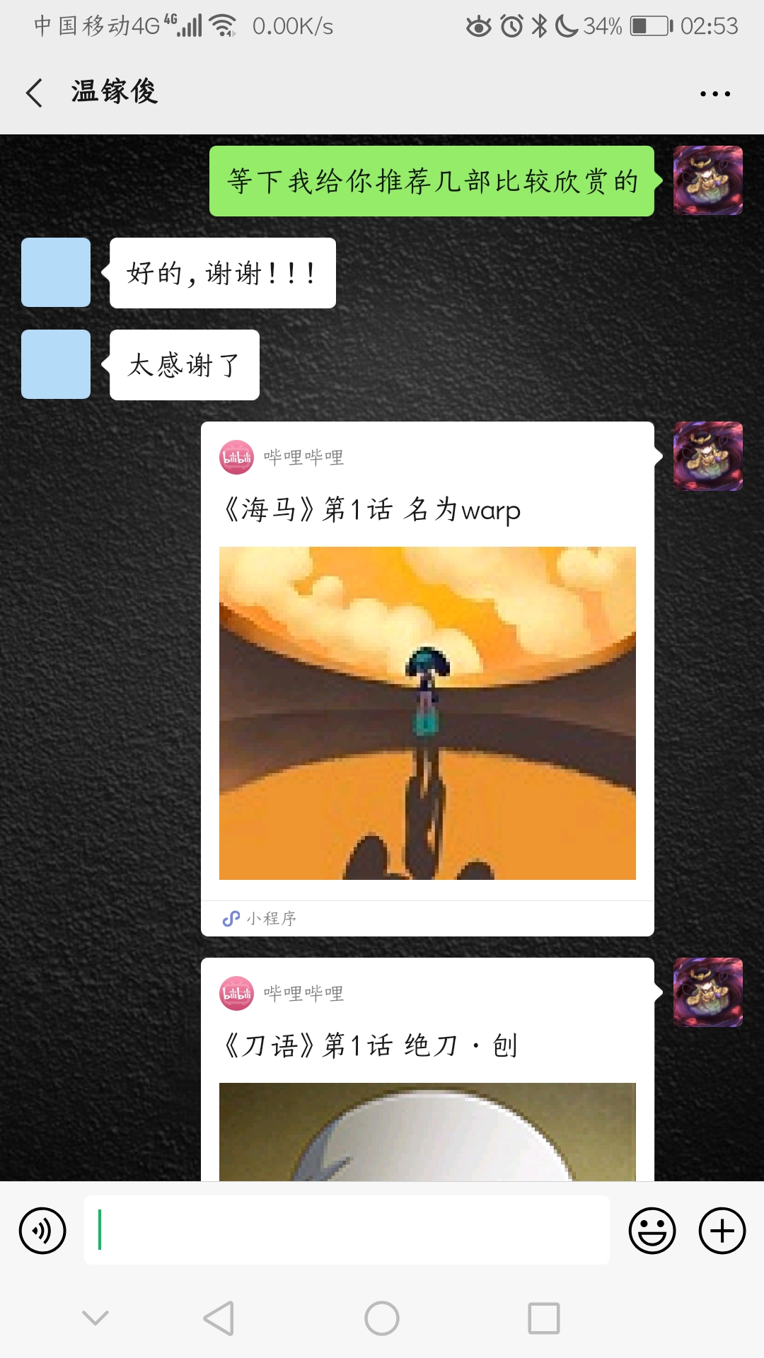温镓俊-聊天记录 发表于 2020-04-01 更新于 2025-11-26 本文字数: 150 阅读时长 ≈ 1 分钟 海马-汤浅政明刀语-西尾维新灰羽联盟-安倍吉俊重启咲良田-河野裕鸦KARAS-龙之子工作室 这些应该都可以被google搜到,如果你们在看到这篇文章时链接不幸挂掉了的话,你们直接往google里面输入海马 汤浅政明类似这样的搜索字词就可以搜到对应作品