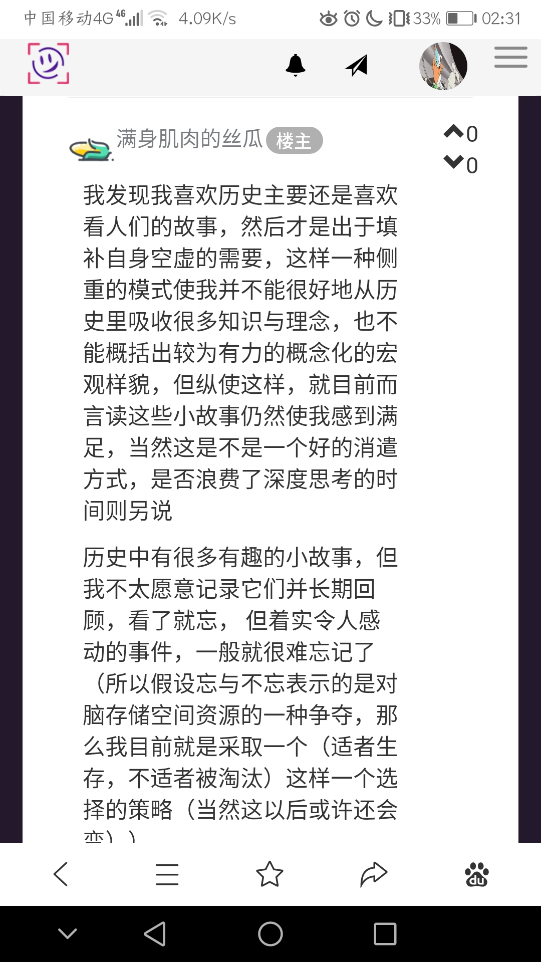 我发现我喜欢历史主要还是喜欢看人们的故事,然后才是出于填补自身空虚的需要,这样一种侧重的模式使我并不能很好地从历史里吸收很多知识与理念,也不能概括出较为有力的概念化的宏观样貌,但纵使这样,就目前而言读这些小故事仍然使我感到满足,当然这是不是一个好的消遣方式,是否浪费了深度思考的时间则另说