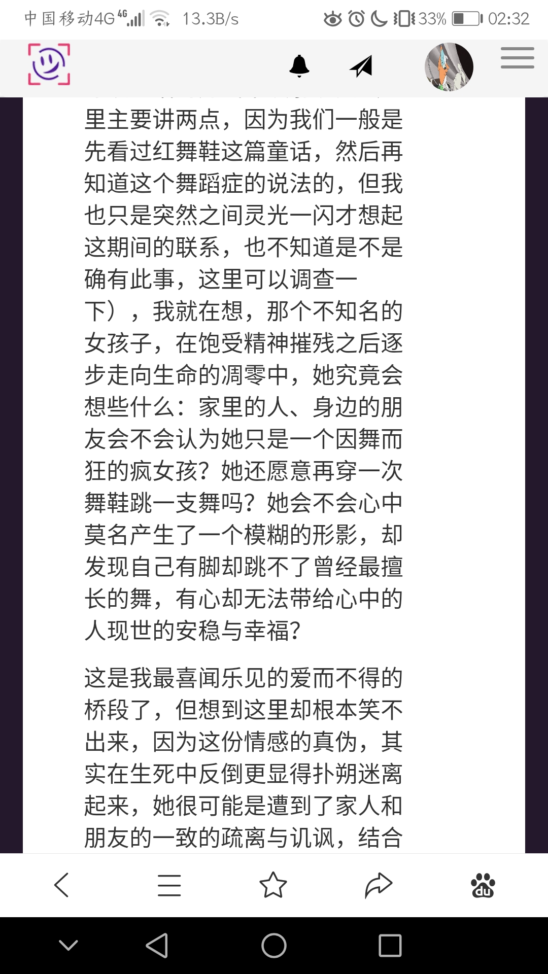 另一件是,距亨廷顿舞蹈症被发现前数十年间的《红舞鞋》一篇童话,安徒生可能确实发现了这种现象,但他无法准确描述,只好以童话的方式来映射现实(这里主要讲两点,因为我们一般是先看过红舞鞋这篇童话,然后再知道这个舞蹈症的说法的,但我也只是突然之间灵光一闪才想起这期间的联系,也不知道是不是确有此事,这里可以调查一下),我就在想,那个不知名的女孩子,在饱受精神摧残之后逐步走向生命的凋零中,她究竟会想些什么:家里的人、身边的朋友会不会认为她只是一个因舞而狂的疯女孩?她还愿意再穿一次舞鞋跳一支舞吗?她会不会心中莫名产生了一个模糊的形影,却发现自己有脚却跳不了曾经最擅长的舞,有心却无法带给心中的人现世的安稳与幸福?