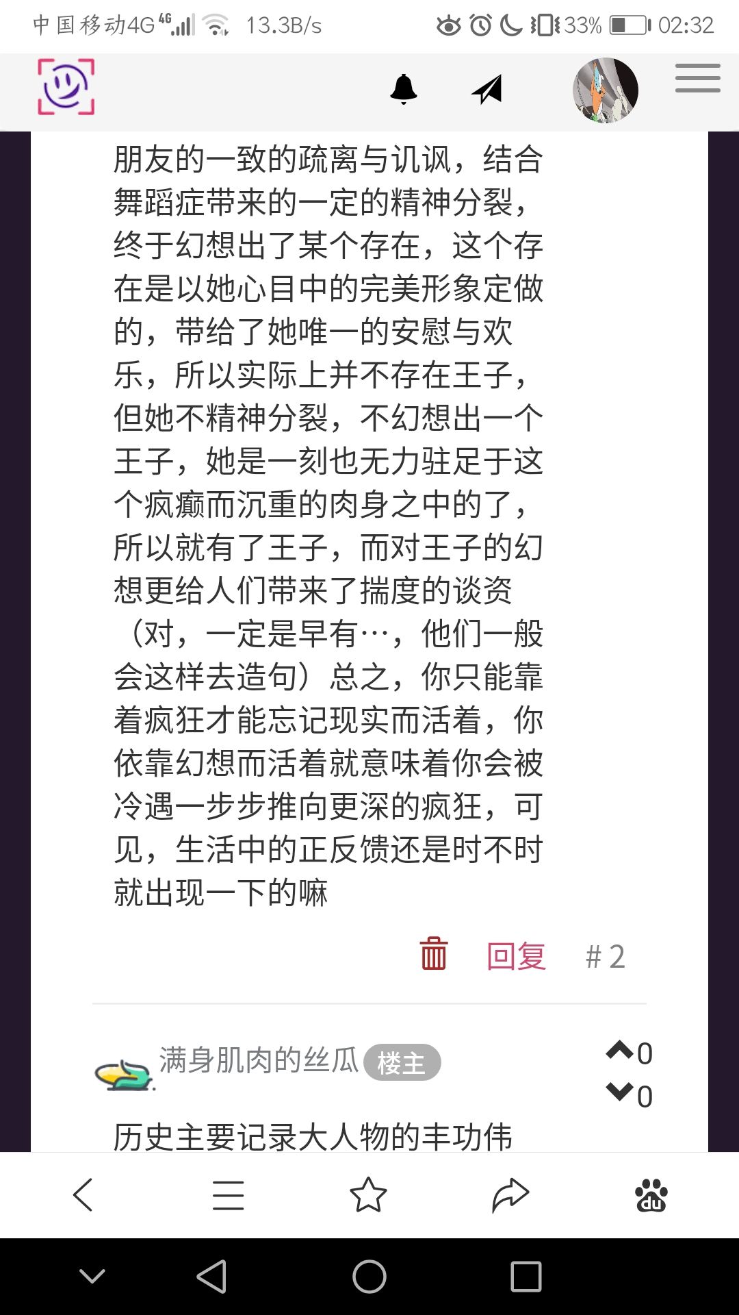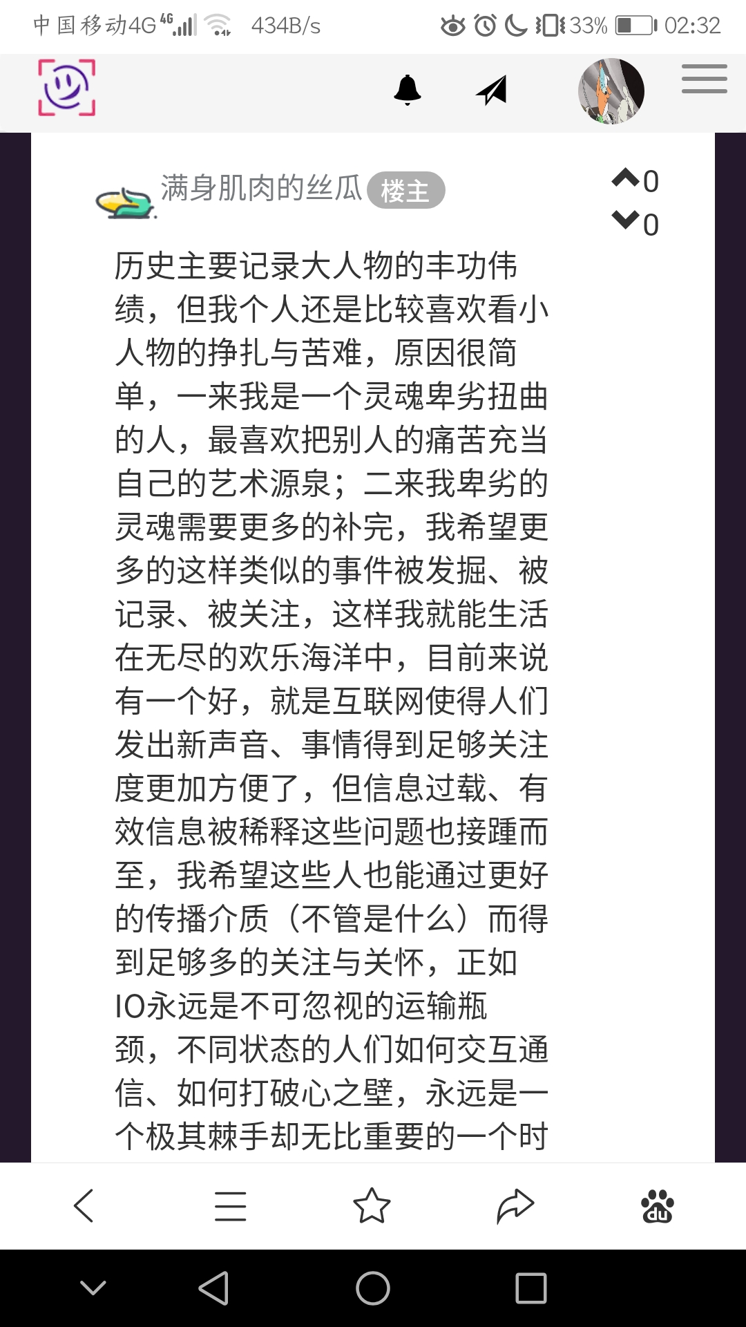 历史主要记录大人物的丰功伟绩,但我个人还是比较喜欢看小人物的挣扎与苦难,原因很简单,一来我是一个灵魂卑劣扭曲的人,最喜欢把别人的痛苦充当自己的艺术源泉;二来我卑劣的灵魂需要更多的补完,我希望更多的这样类似的事件被发掘、被记录、被关注,这样我就能生活在无尽的欢乐海洋中,目前来说有一个好,就是互联网使得人们发出新声音、事情得到足够关注度更加方便了,但信息过载、有效信息被稀释这些问题也接踵而至,我希望这些人也能通过更好的传播介质(不管是什么)而得到足够多的关注与关怀,正如IO永远是不可忽视的运输瓶颈,不同状态的人们如何交互通信、如何打破心之壁,永远是一个极其棘手却无比重要的一个时代母题;小人物一生到底有哪些亮点值得流传在各式各样的历史数据流中,哪些样例能成为未来时态下某些事件的启发与凭据,都是值得每个时代的人好好思考的
