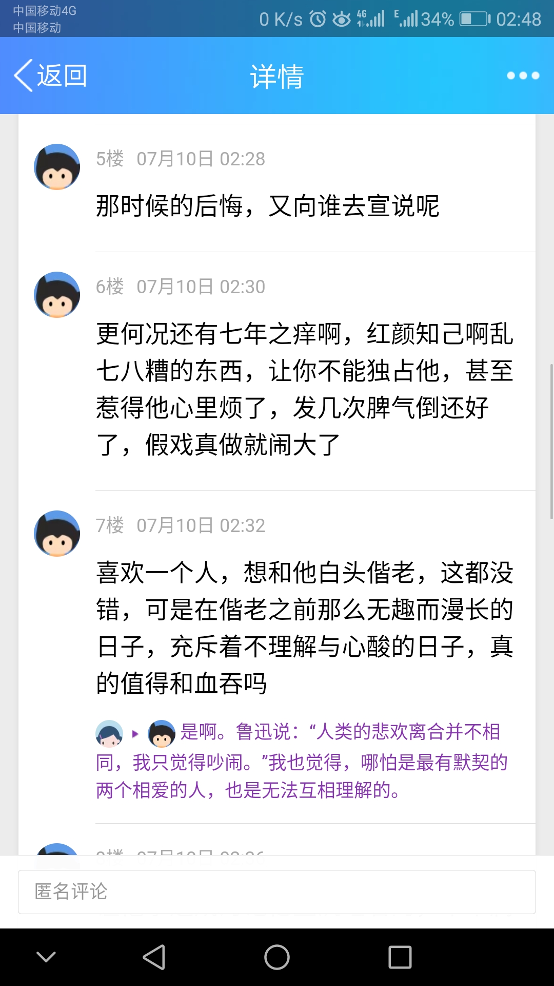 是啊。鲁迅说:“人类的悲欢离合并不相同,我只觉得吵闹。”我也觉得,哪怕是最有默契的两个相爱的人,也是无法互相理解的。