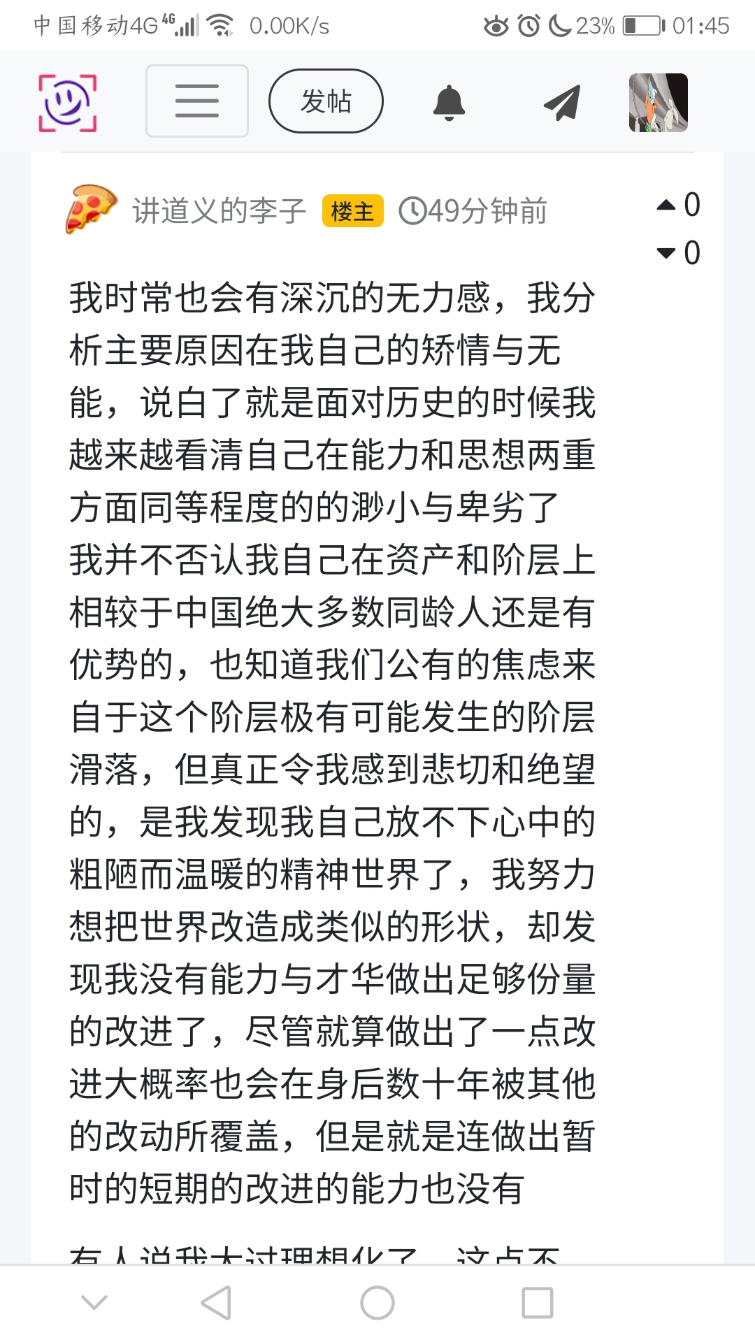 我并不否认我自己在资产和阶层上相较于中国绝大多数同龄人还是有优势的,也知道我们公有的焦虑来自于这个阶层极有可能发生的阶层滑落,但真正令我感到悲切和绝望的,是我发现我自己放不下心中的粗陋而温暖的精神世界了,我努力想把世界改造成类似的形状,却发现我没有能力与才华做出足够份量的改进了,尽管就算做出了一点改进大概率也会在身后数十年被其他的改动所覆盖,但是就是连做出暂时的短期的改进的能力也没有