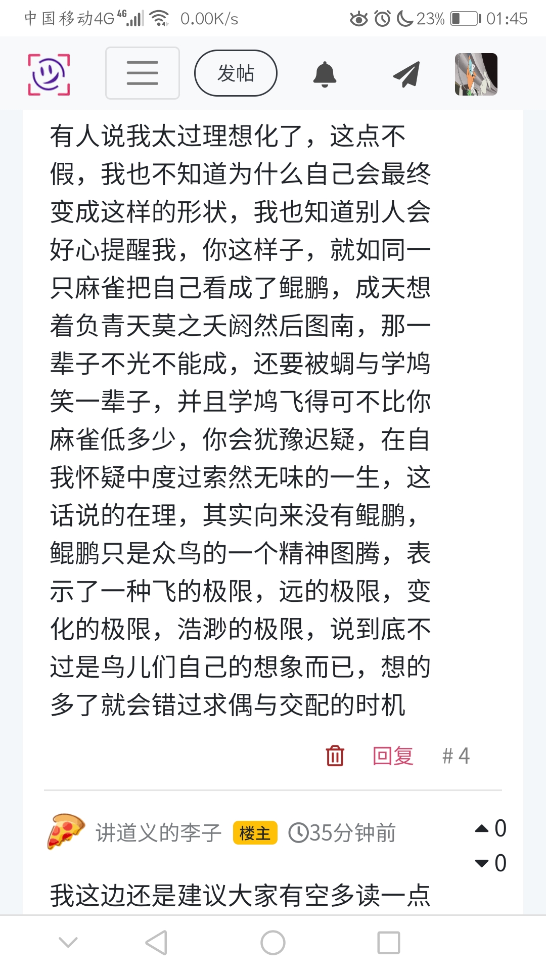有人说我太过理想化了,这点不假,我也不知道为什么自己会最终变成这样的形状,我也知道别人会好心提醒我,你这样子,就如同一只麻雀把自己看成了鲲鹏,成天想着负青天莫之夭阏然后图南,那一辈子不光不能成,还要被蜩与学鸠笑一辈子,并且学鸠飞得可不比你麻雀低多少,你会犹豫迟疑,在自我怀疑中度过索然无味的一生,这话说的在理,其实向来没有鲲鹏,鲲鹏只是众鸟的一个精神图腾,表示了一种飞的极限,远的极限,变化的极限,浩渺的极限,说到底不过是鸟儿们自己的想象而已,想的多了就会错过求偶与交配的时机