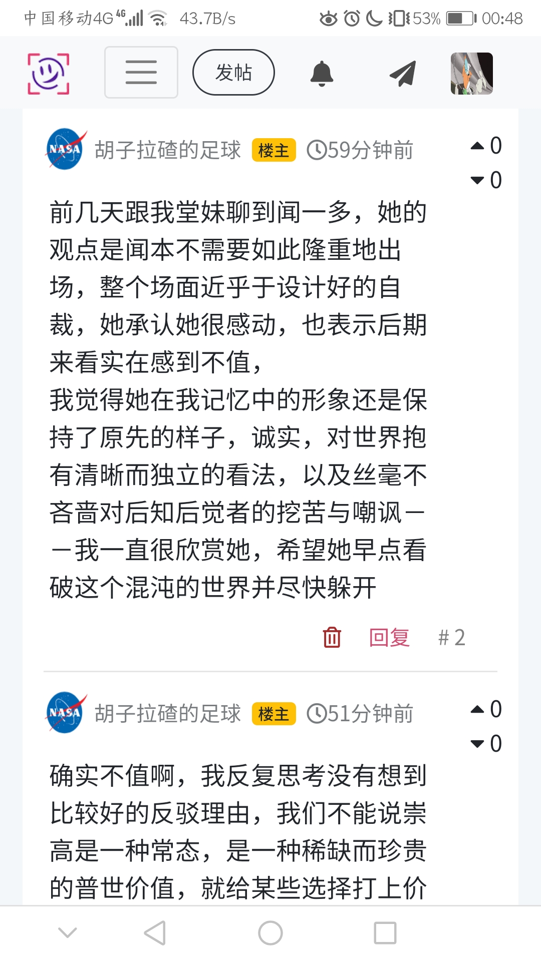 前几天跟我堂妹聊到闻一多,她的观点是闻本不需要如此隆重地出场,整个场面近乎于设计好的自裁,她承认她很感动,也表示后期来看实在感到不值,