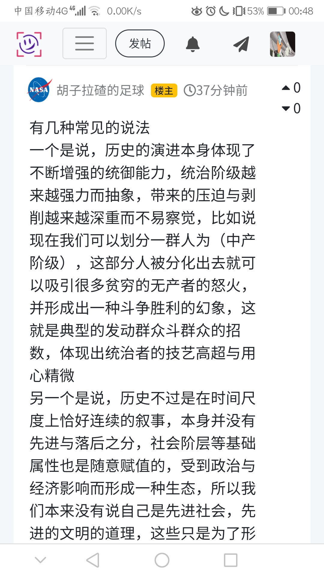 一个是说,历史的演进本身体现了不断增强的统御能力,统治阶级越来越强力而抽象,带来的压迫与剥削越来越深重而不易察觉,比如说现在我们可以划分一群人为(中产阶级),这部分人被分化出去就可以吸引很多贫穷的无产者的怒火,并形成出一种斗争胜利的幻象,这就是典型的发动群众斗群众的招数,体现出统治者的技艺高超与用心精微