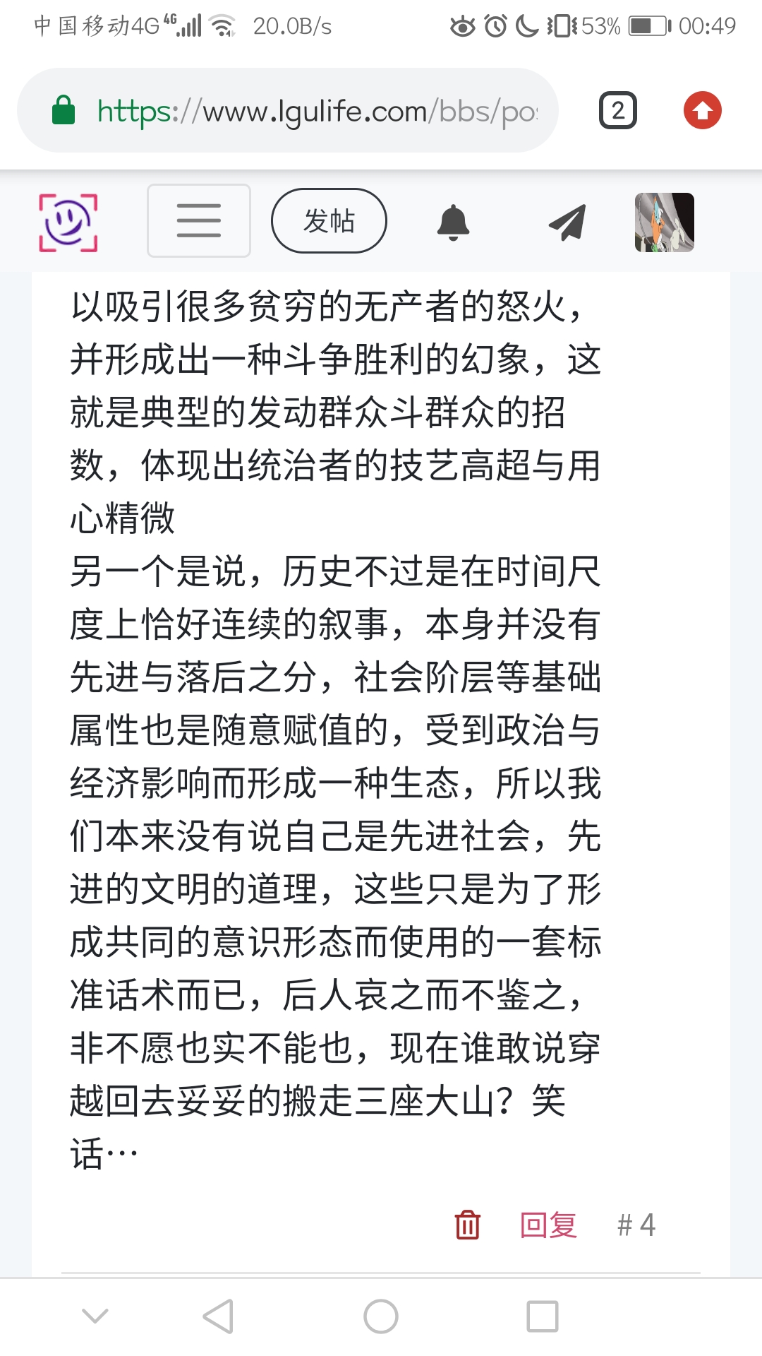 另一个是说,历史不过是在时间尺度上恰好连续的叙事,本身并没有先进与落后之分,社会阶层等基础属性也是随意赋值的,受到政治与经济影响而形成一种生态,所以我们本来没有说自己是先进社会,先进的文明的道理,这些只是为了形成共同的意识形态而使用的一套标准话术而已,后人哀之而不鉴之,非不愿也实不能也,现在谁敢说穿越回去妥妥的搬走三座大山?笑话…