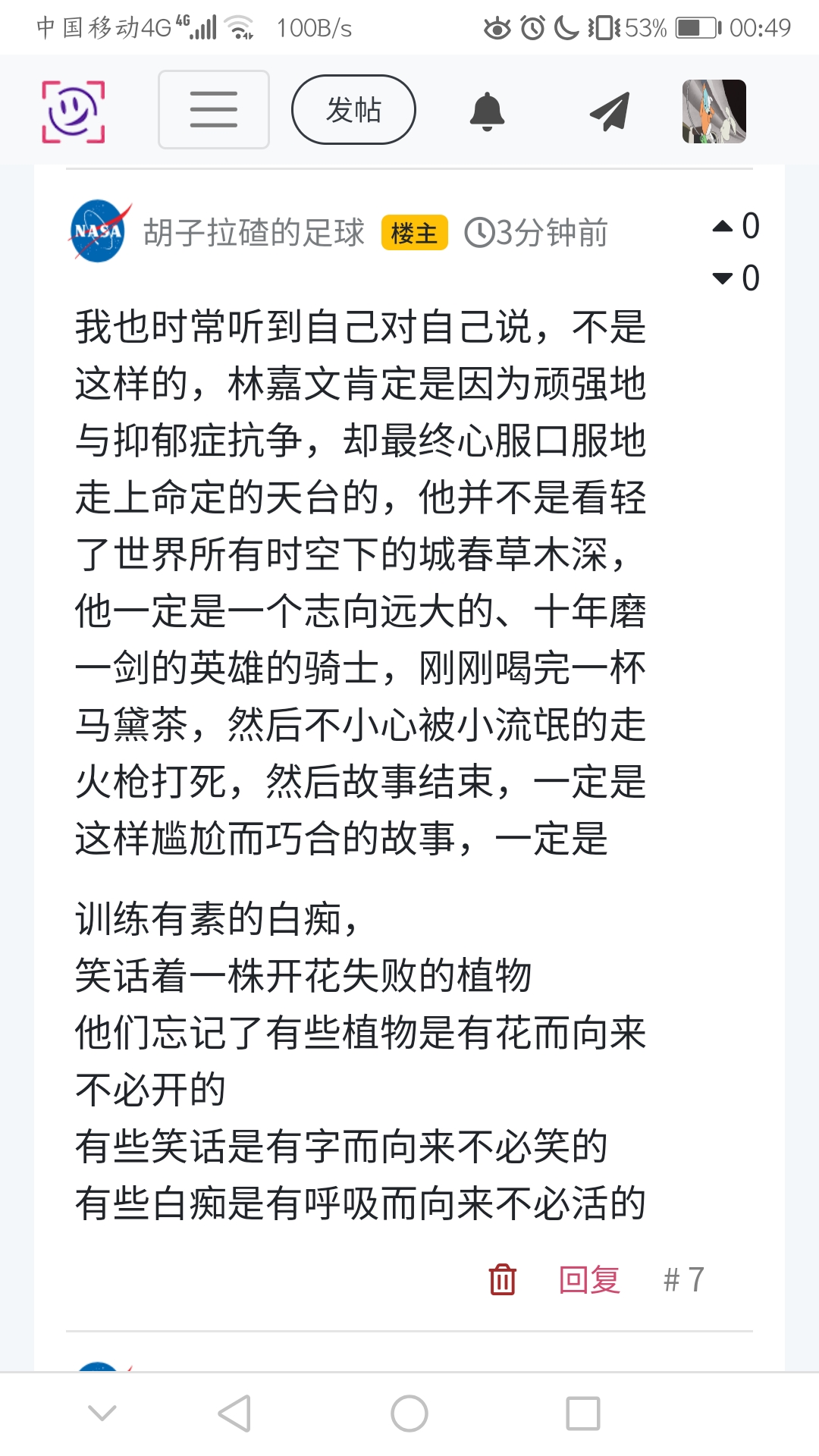 我也时常听到自己对自己说,不是这样的,林嘉文肯定是因为顽强地与抑郁症抗争,却最终心服口服地走上命定的天台的,他并不是看轻了世界所有时空下的城春草木深,他一定是一个志向远大的、十年磨一剑的英雄的骑士,刚刚喝完一杯马黛茶,然后不小心被小流氓的走火枪打死,然后故事结束,一定是这样尴尬而巧合的故事,一定是