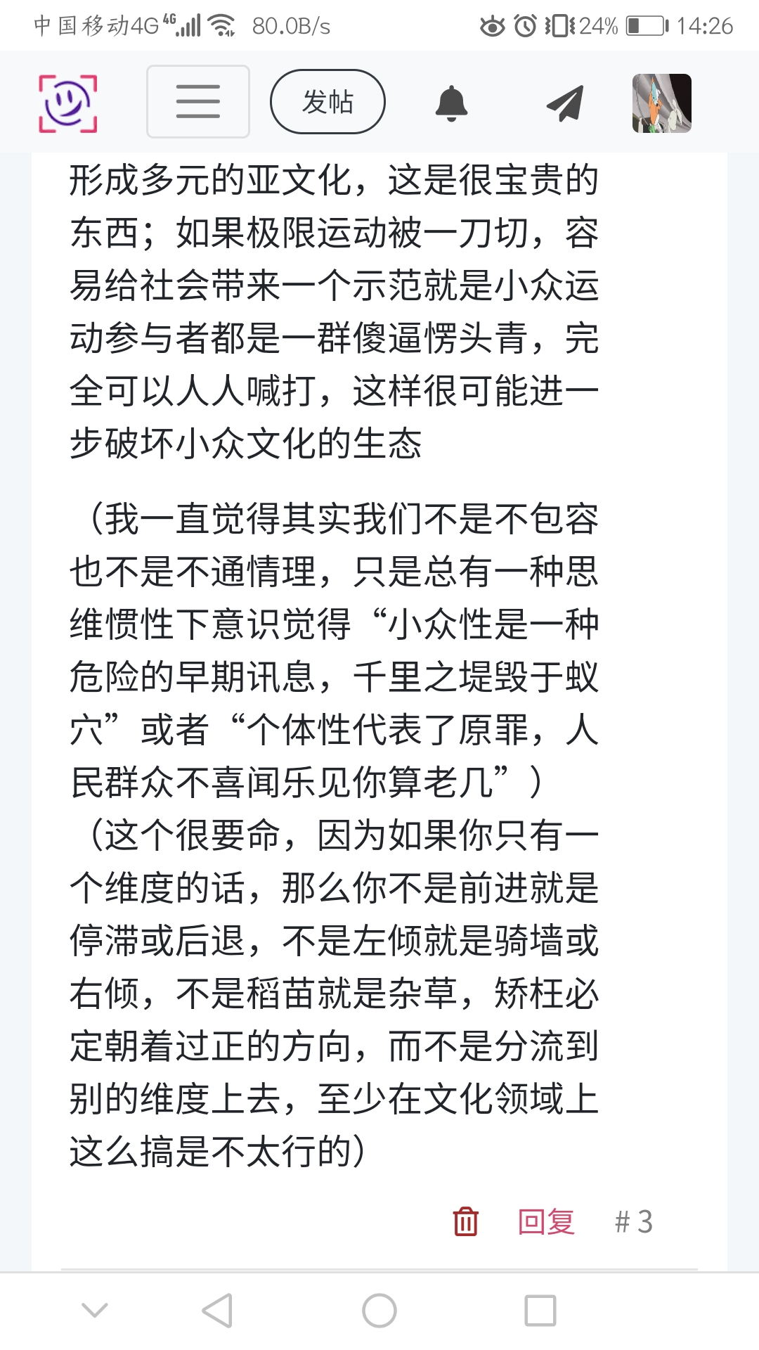 其次,立法层面上不能将这种活动一棍子打死,因为极限运动其实是小众活动、小众娱乐的一个缩影,而这些小众活动与小众娱乐很容易形成多元的亚文化,这是很宝贵的东西;如果极限运动被一刀切,容易给社会带来一个示范就是小众运动参与者都是一群傻逼愣头青,完全可以人人喊打,这样很可能进一步破坏小众文化的生态