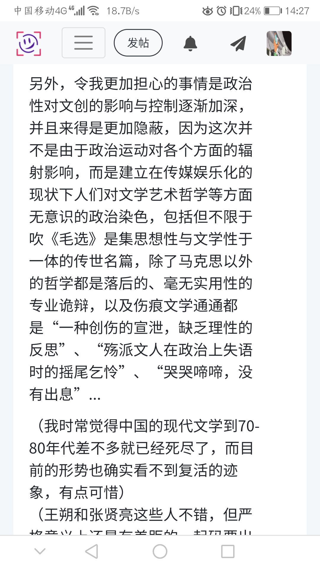 另外,令我更加担心的事情是政治性对文创的影响与控制逐渐加深,并且来得是更加隐蔽,因为这次并不是由于政治运动对各个方面的辐射影响,而是建立在传媒娱乐化的现状下人们对文学艺术哲学等方面无意识的政治染色,包括但不限于吹《毛选》是集思想性与文学性于一体的传世名篇,除了马克思以外的哲学都是落后的、毫无实用性的专业诡辩,以及伤痕文学通通都是“一种创伤的宣泄,缺乏理性的反思”、“殇派文人在政治上失语时的摇尾乞怜”、“哭哭啼啼,没有出息”…