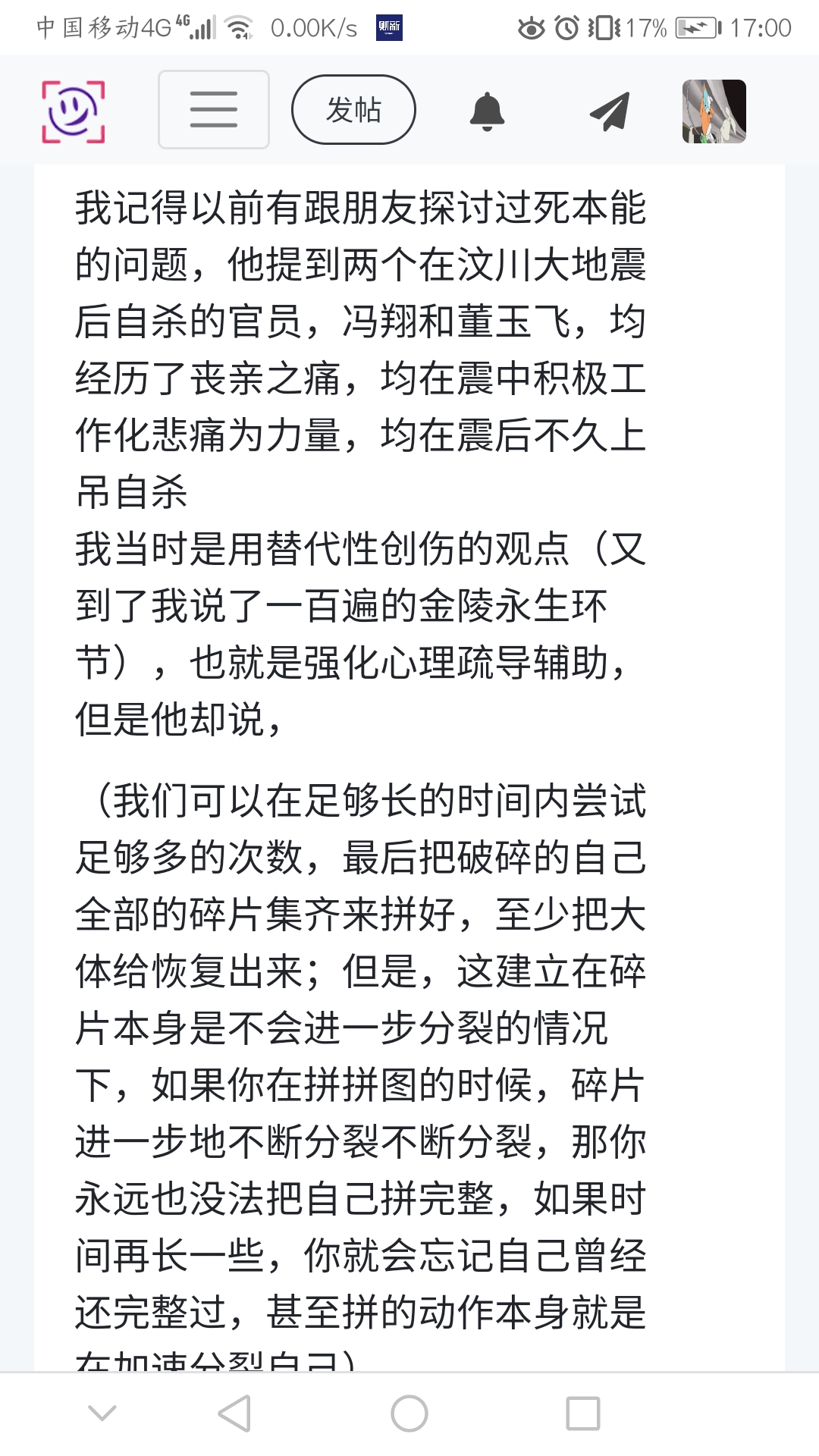 我记得以前有跟朋友探讨过死本能的问题,他提到两个在汶川大地震后自杀的官员,冯翔和董玉飞,均经历了丧亲之痛,均在震中积极工作化悲痛为力量,均在震后不久上吊自杀