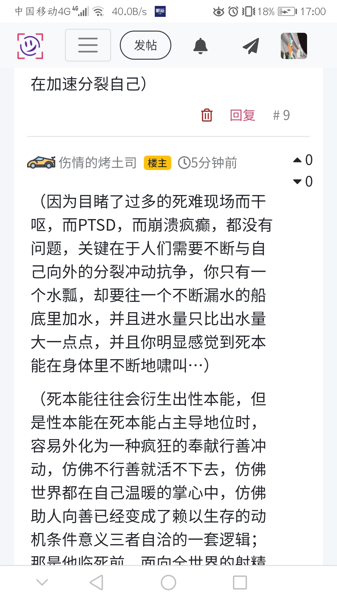 (因为目睹了过多的死难现场而干呕,而PTSD,而崩溃疯癫,都没有问题,关键在于人们需要不断与自己向外的分裂冲动抗争,你只有一个水瓢,却要往一个不断漏水的船底里加水,并且进水量只比出水量大一点点,并且你明显感觉到死本能在身体里不断地啸叫…)