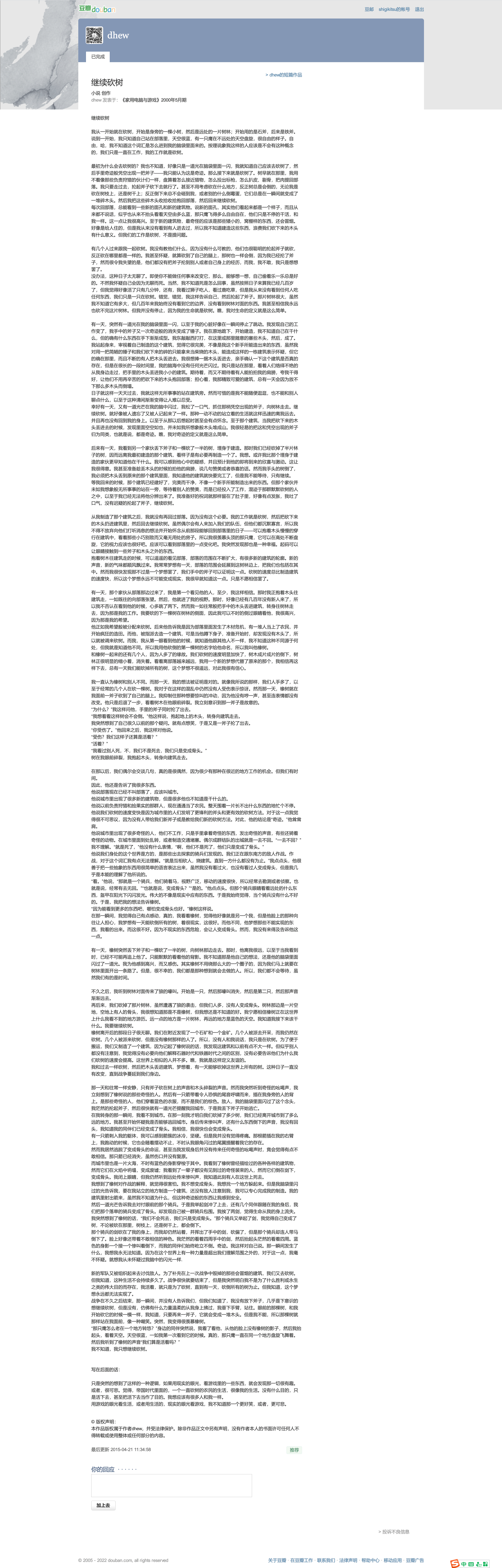 等我回来的时候,那个建筑已经建好了,完美而干净,不像一个新手所能制造出来的东西。但那个家伙并未如我想象般无所事事的站在一旁,等待着别人的赞美,而是已经投入了工作,混迹于那群默默砍树的人之中,以至于我已经无法将他分辨出来了。我准备好的祝词就那样留在了肚子里,好像有点发胀,我吐了口气,没有迟疑的抡起了斧子,继续砍树。