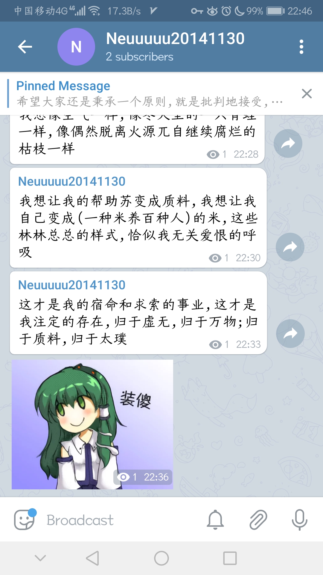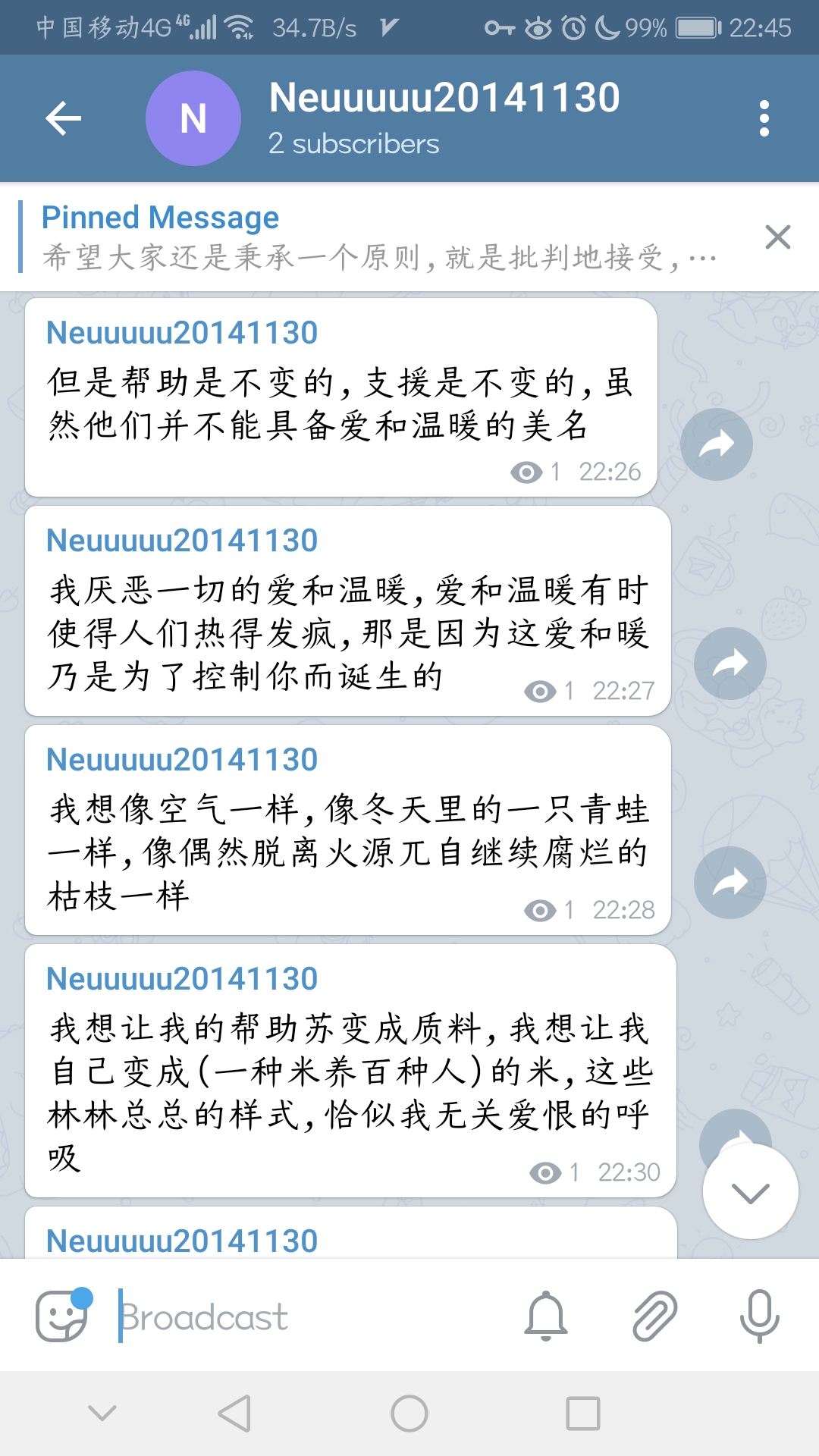 我有一种很奇特的,想要变成一种娇小柔美的存在的意念,但并不是变成女生,因为女生也是人,也是污浊的、世俗性的短暂存在,她们只是装在了一个被赋予了更多美的意指的套子里而已,实际上一点也不轻盈不干净,她们不过是因为强迫症式的每天洗脸化妆,才维持了刻板印象意义上的娇美,说实话,这个真的太低俗了,甚至比不上以前老爸单位发的猪油渣子,至少那个还香喷喷的,带来了真实而原始的欢乐