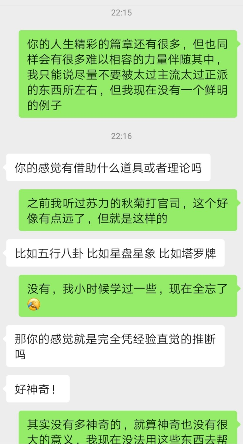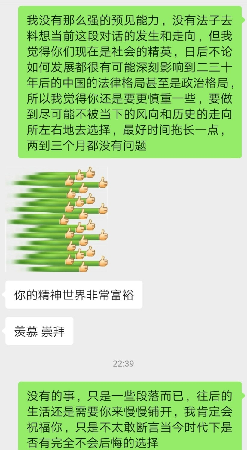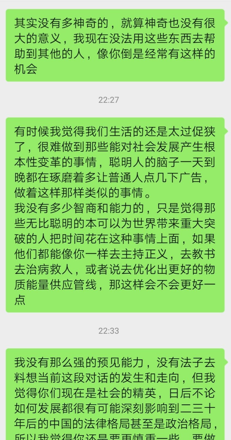 从他朋友圈及对话中不停的赞誉来看,我其实是并不想跟他有进一步的沟通和接触了,所以还是得诈他一下,利用咄咄逼人的大道理打断他的话头,再用没法反驳的话语结束聊天。