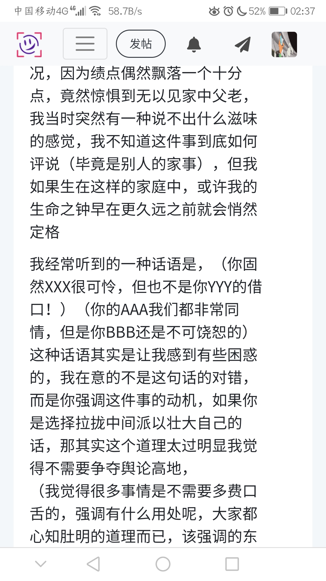 如果你终于说出(我求求你了,我就想找个机会把那些狗逼通通骂一遍行了吧),那也可以,别上升到讨论的地步大家出去喝点茶与酒扯扯淡骂骂人也挺开心,这也算偷得浮生半日闲