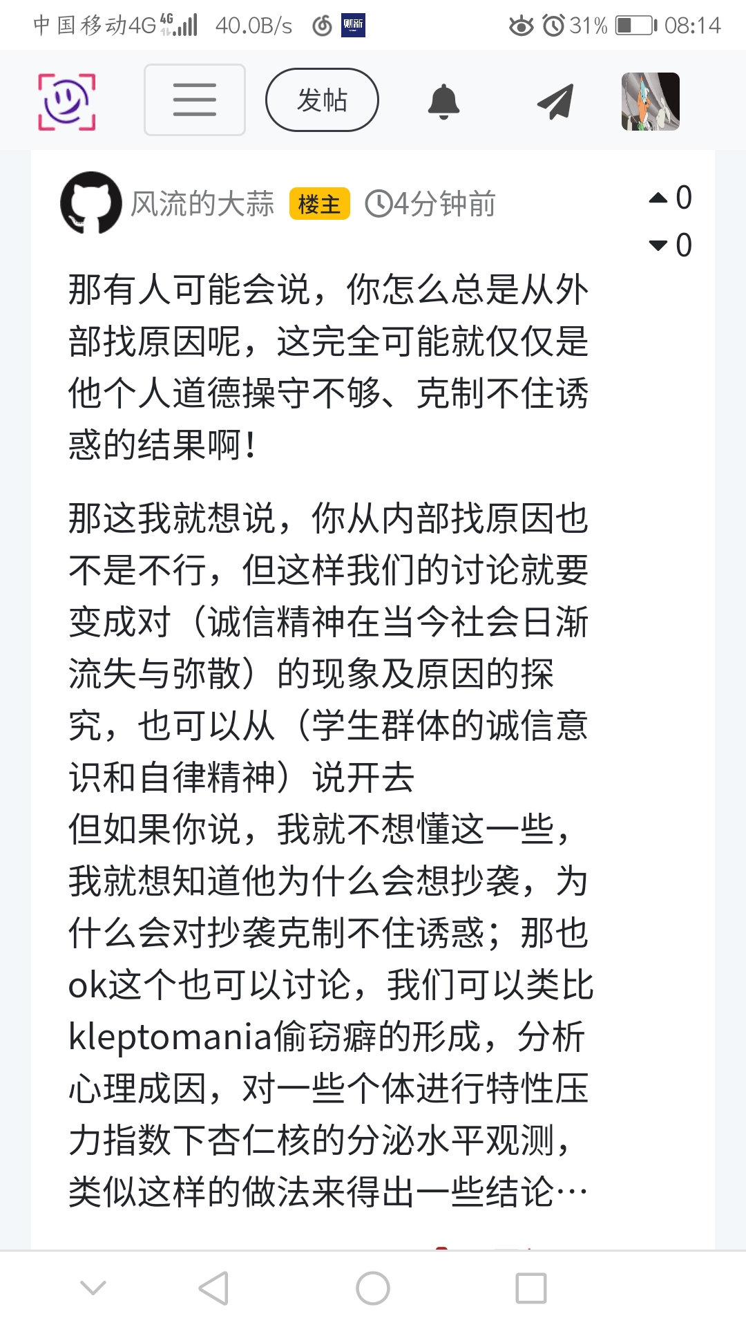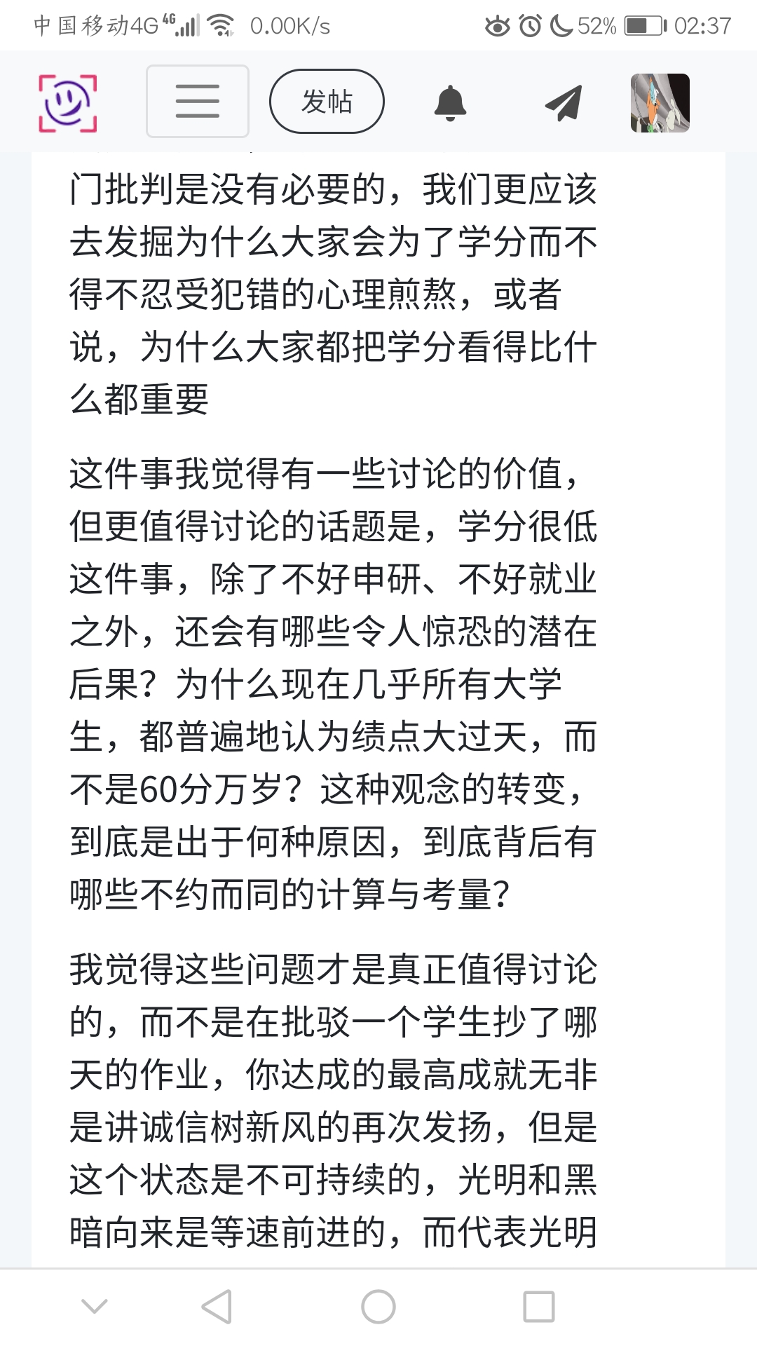 是的,抄袭是错误的这件事大家肯定都清楚,但我觉得批判这件事其实没必要,这并不代表我就赞同这种行为,也不代表我具有(你不容易就要去偷去抢去骗)这种意识,我只是觉得,对这样一件事去做专门批判是没有必要的,我们更应该去发掘为什么大家会为了学分而不得不忍受犯错的心理煎熬,或者说,为什么大家都把学分看得比什么都重要