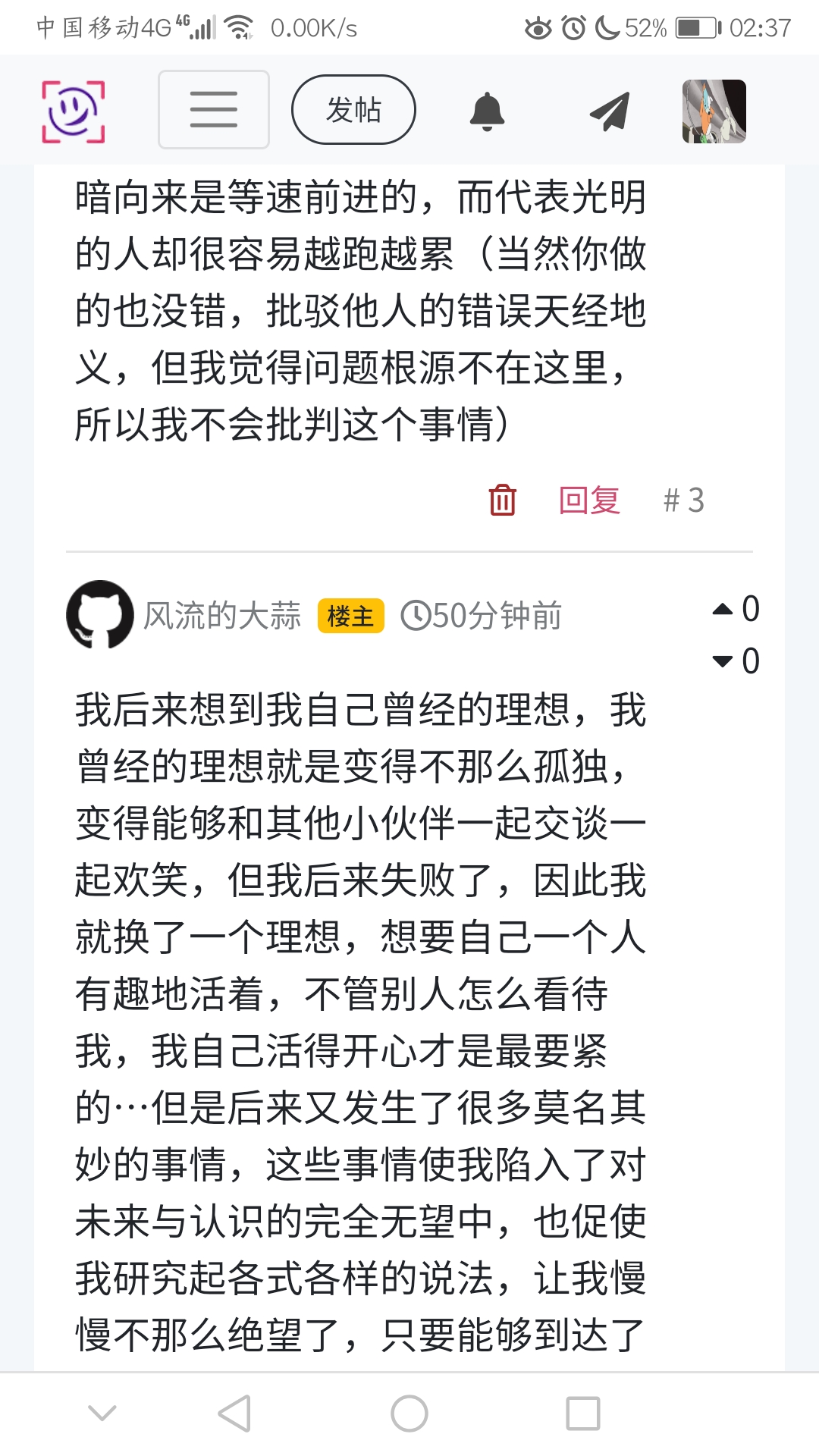 我后来想到我自己曾经的理想,我曾经的理想就是变得不那么孤独,变得能够和其他小伙伴一起交谈一起欢笑,但我后来失败了,因此我就换了一个理想,想要自己一个人有趣地活着,不管别人怎么看待我,我自己活得开心才是最要紧的…但是后来又发生了很多莫名其妙的事情,这些事情使我陷入了对未来与认识的完全无望中,也促使我研究起各式各样的说法,让我慢慢不那么绝望了,只要能够到达了某种称作迷茫的状态,我就觉得我的生活已经迈入了一个新境界了