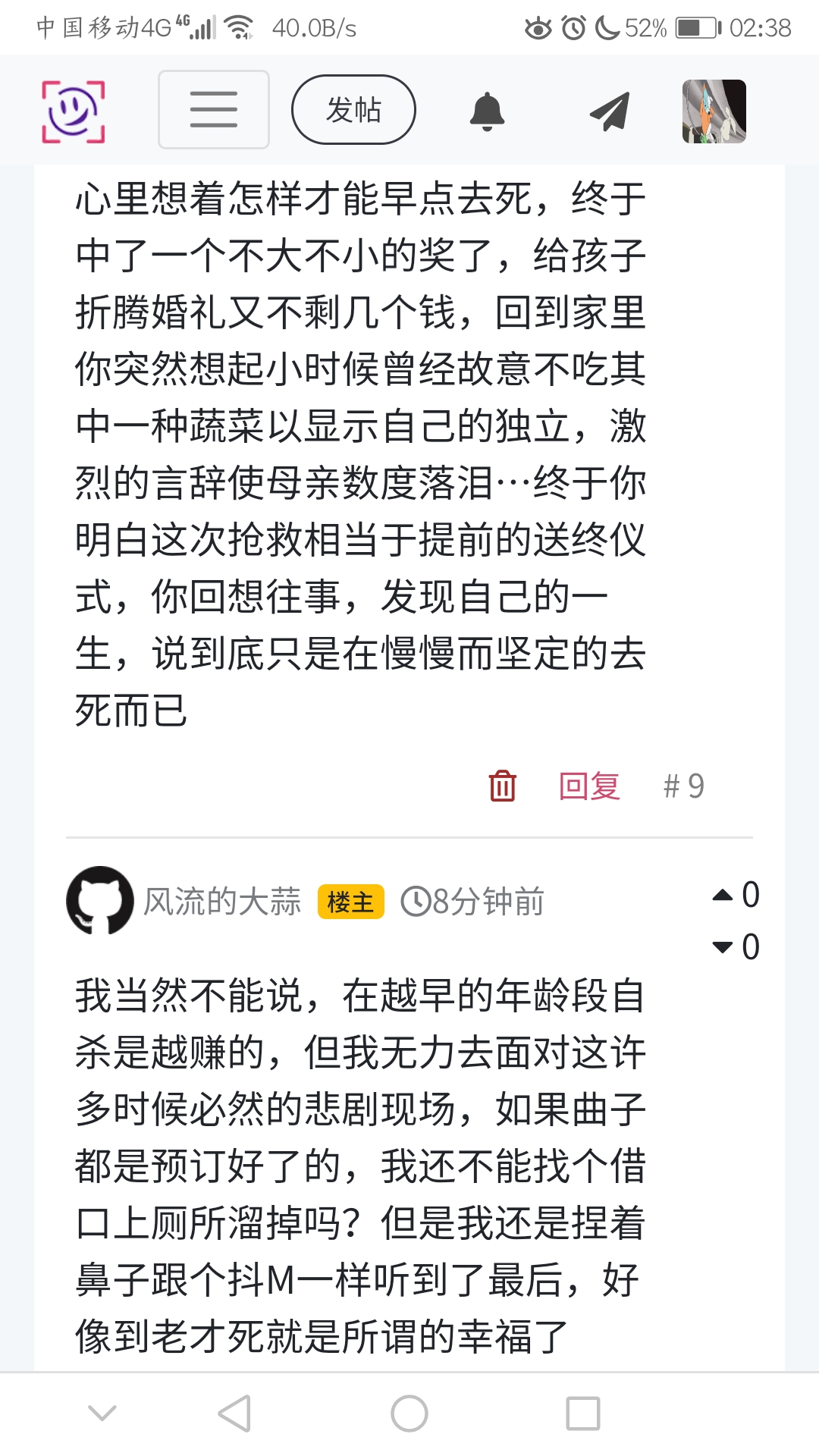 那滋味比你现在所谓的不平要浓烈百倍,你只会想起自己不幸的童年怠惰迷茫的青年与郁郁不得志的壮年和中年,由于服药的关系,连牙龈都折磨自己每天必定大量流血…你终于成为了标准的中年油腻男,心里想着怎样才能早点去死,终于中了一个不大不小的奖了,给孩子折腾婚礼又不剩几个钱,回到家里你突然想起小时候曾经故意不吃其中一种蔬菜以显示自己的独立,激烈的言辞使母亲数度落泪…终于你明白这次抢救相当于提前的送终仪式,你回想往事,发现自己的一生,说到底只是在慢慢而坚定的去死而已