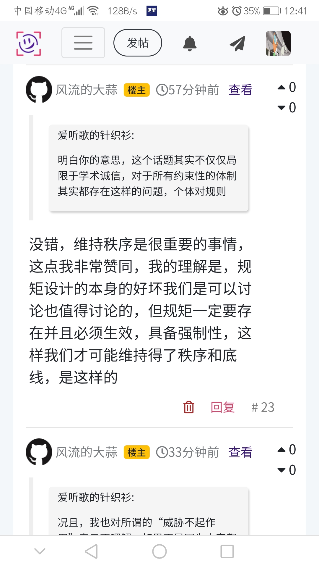 (威胁不起作用)这一点我本来是想说,我觉得规则它主要是维持一种秩序,并对违规行为的惩戒进行保证,确保惩戒的不可逃避,但人们心中对规则给与的裁量是否满意,这一点是规则本身不可能提供的,这是一点;另一点,某些规则也可能本身不合理,这个不合理可能源于许多因素,可能确实有它的历史成因和时代烙印,但是不合理的终究不合理,就和宣布“杀人无罪”一样,当然有些人会这么觉得(大多数人不满意,这个规则不可能合理),我觉得这一点同样也有待商榷