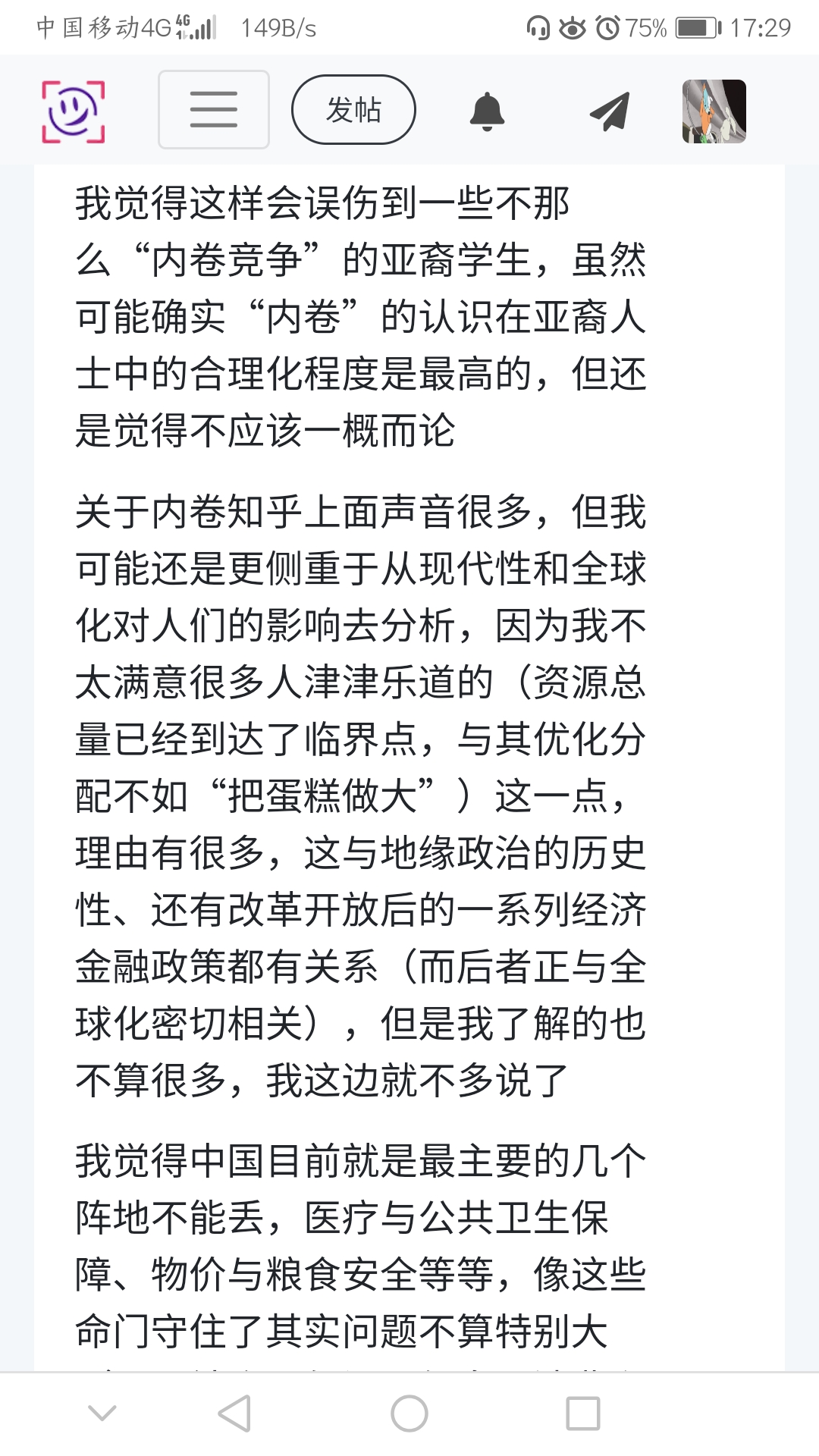 关于内卷知乎上面声音很多,但我可能还是更侧重于从现代性和全球化对人们的影响去分析,因为我不太满意很多人津津乐道的(资源总量已经到达了临界点,与其优化分配不如“把蛋糕做大”)这一点,理由有很多,这与地缘政治的历史性、还有改革开放后的一系列经济金融政策都有关系(而后者正与全球化密切相关),但是我了解的也不算很多,我这边就不多说了