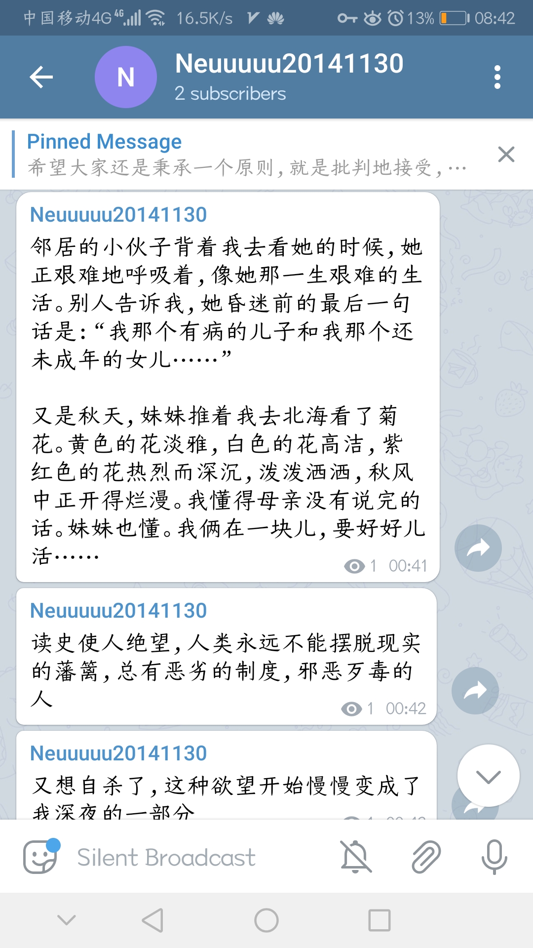 又是秋天,妹妹推着我去北海看了菊花。黄色的花淡雅,白色的花高洁,紫红色的花热烈而深沉,泼泼洒洒,秋风中正开得烂漫。我懂得母亲没有说完的话。妹妹也懂。我俩在一块儿,要好好儿活……
