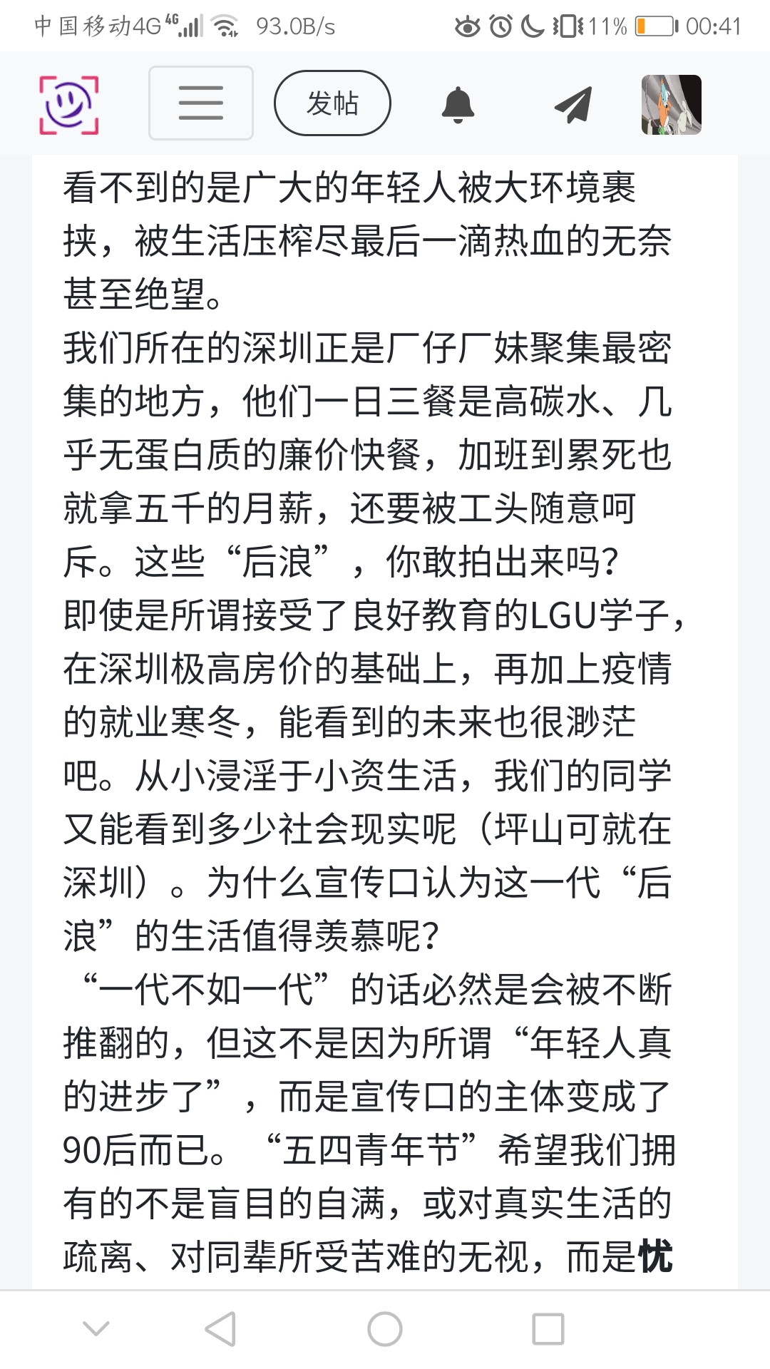 即使是所谓接受了良好教育的LGU学子,在深圳极高房价的基础上,再加上疫情的就业寒冬,能看到的未来也很渺茫吧。从小浸淫于小资生活,我们的同学又能看到多少社会现实呢(坪山可就在深圳)。为什么宣传口认为这一代“后浪”的生活值得羡慕呢?