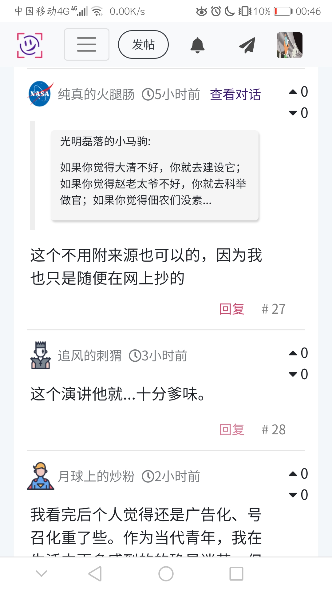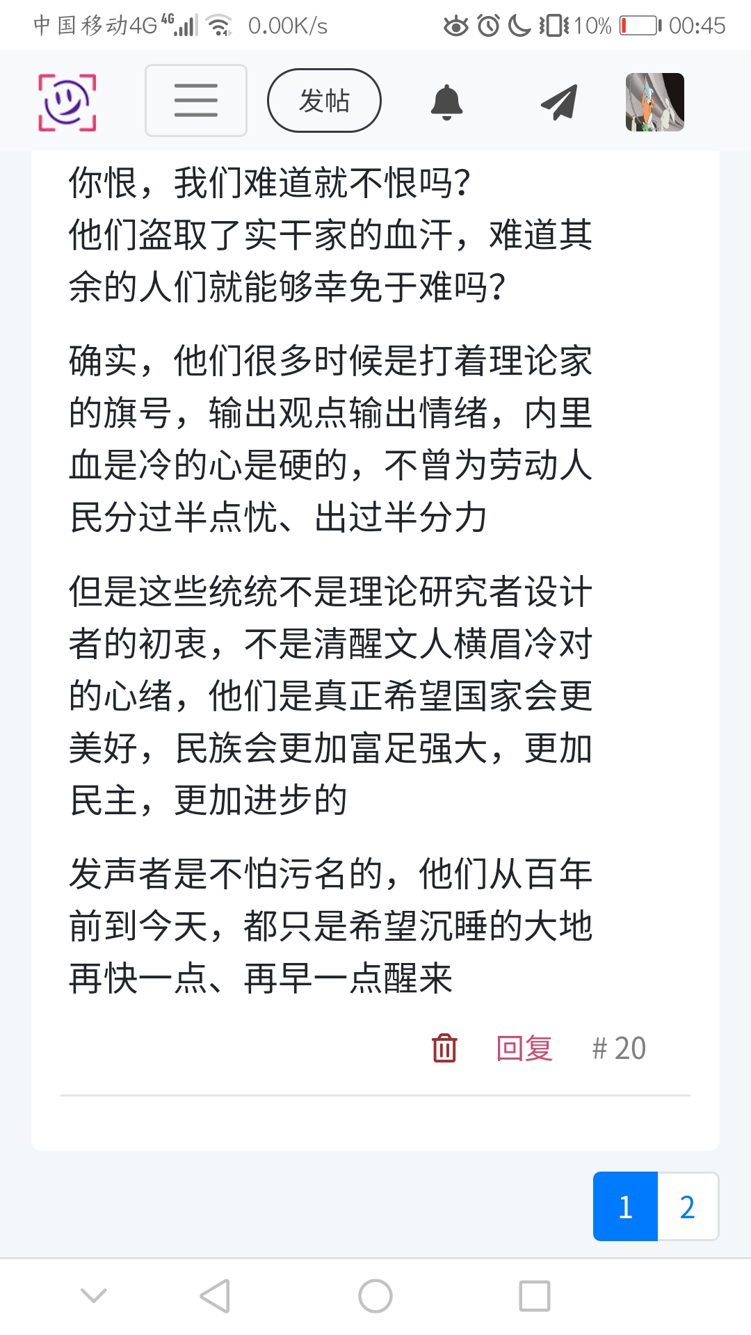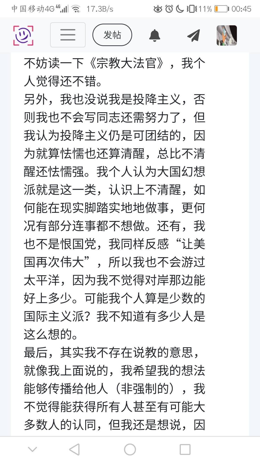 另外,我也没说我是投降主义,否则我也不会写同志还需努力了,但我认为投降主义仍是可团结的,因为就算怯懦也还算清醒,总比不清醒还怯懦强。我个人认为大国幻想派就是这一类,认识上不清醒,如何能在现实脚踏实地地做事,更何况有部分连事都不想做。还有,我也不是恨国党,我同样反感“让美国再次伟大”,所以我也不会游过太平洋,因为我不觉得对岸那边能好上多少。可能我个人算是少数的国际主义派?我不知道有多少人是这么想的。