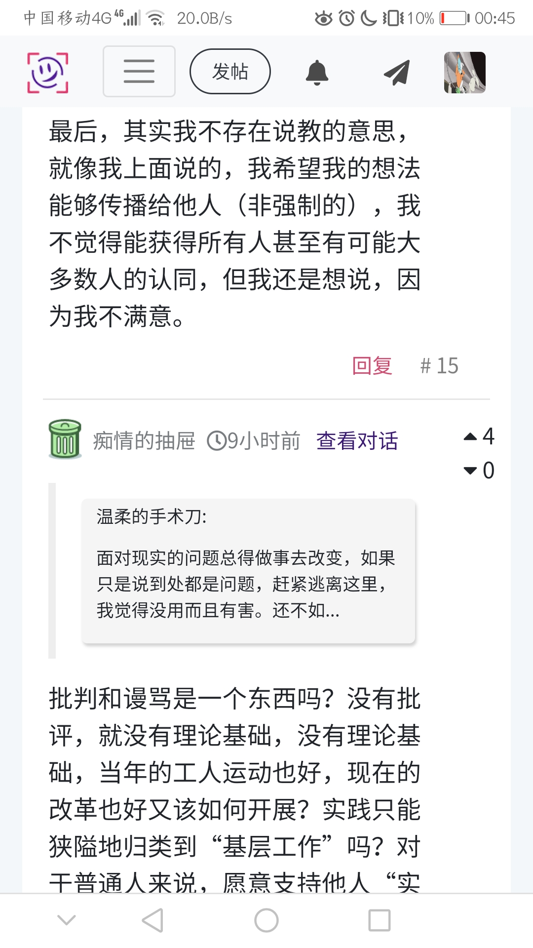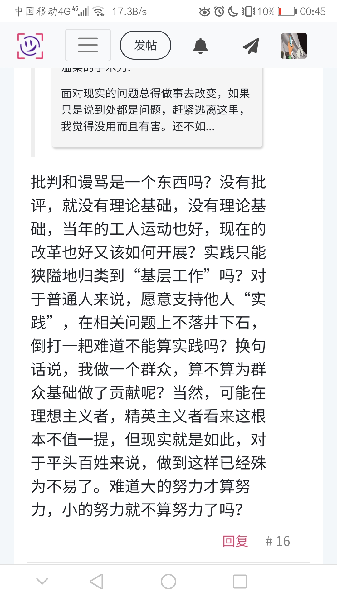 批判和谩骂是一个东西吗?没有批评,就没有理论基础,没有理论基础,当年的工人运动也好,现在的改革也好又该如何开展?实践只能狭隘地归类到“基层工作”吗?对于普通人来说,愿意支持他人“实践”,在相关问题上不落井下石,倒打一耙难道不能算实践吗?换句话说,我做一个群众,算不算为群众基础做了贡献呢?当然,可能在理想主义者,精英主义者看来这根本不值一提,但现实就是如此,对于平头百姓来说,做到这样已经殊为不易了。难道大的努力才算努力,小的努力就不算努力了吗?
