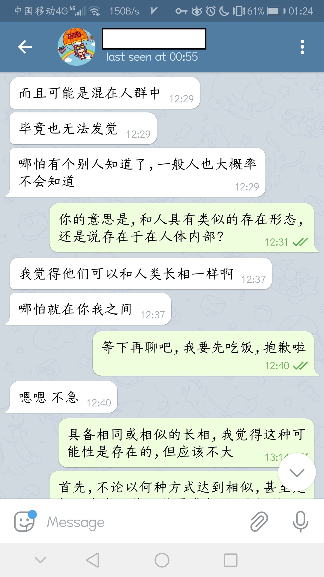 等下再聊吧,我要先吃饭,抱歉啦