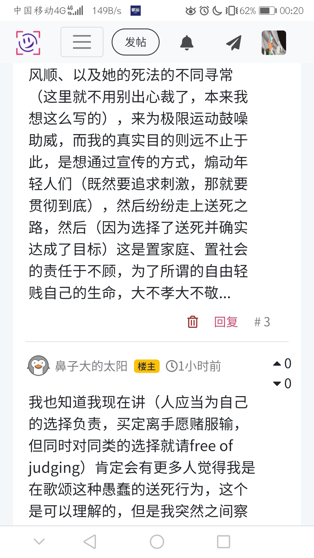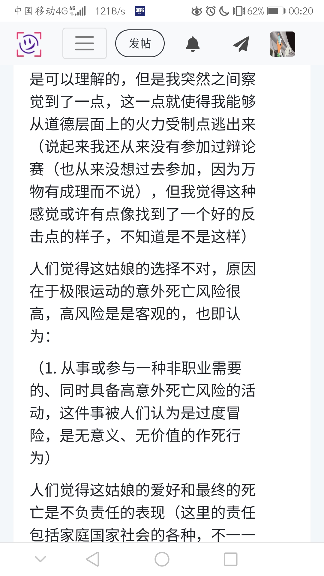 我也知道我现在讲(人应当为自己的选择负责,买定离手愿赌服输,但同时对同类的选择就请free of judging)肯定会有更多人觉得我是在歌颂这种愚蠢的送死行为,这个是可以理解的,但是我突然之间察觉到了一点,这一点就使得我能够从道德层面上的火力受制点逃出来(说起来我还从来没有参加过辩论赛(也从来没想过去参加,因为万物有成理而不说),但我觉得这种感觉或许有点像找到了一个好的反击点的样子,不知道是不是这样)