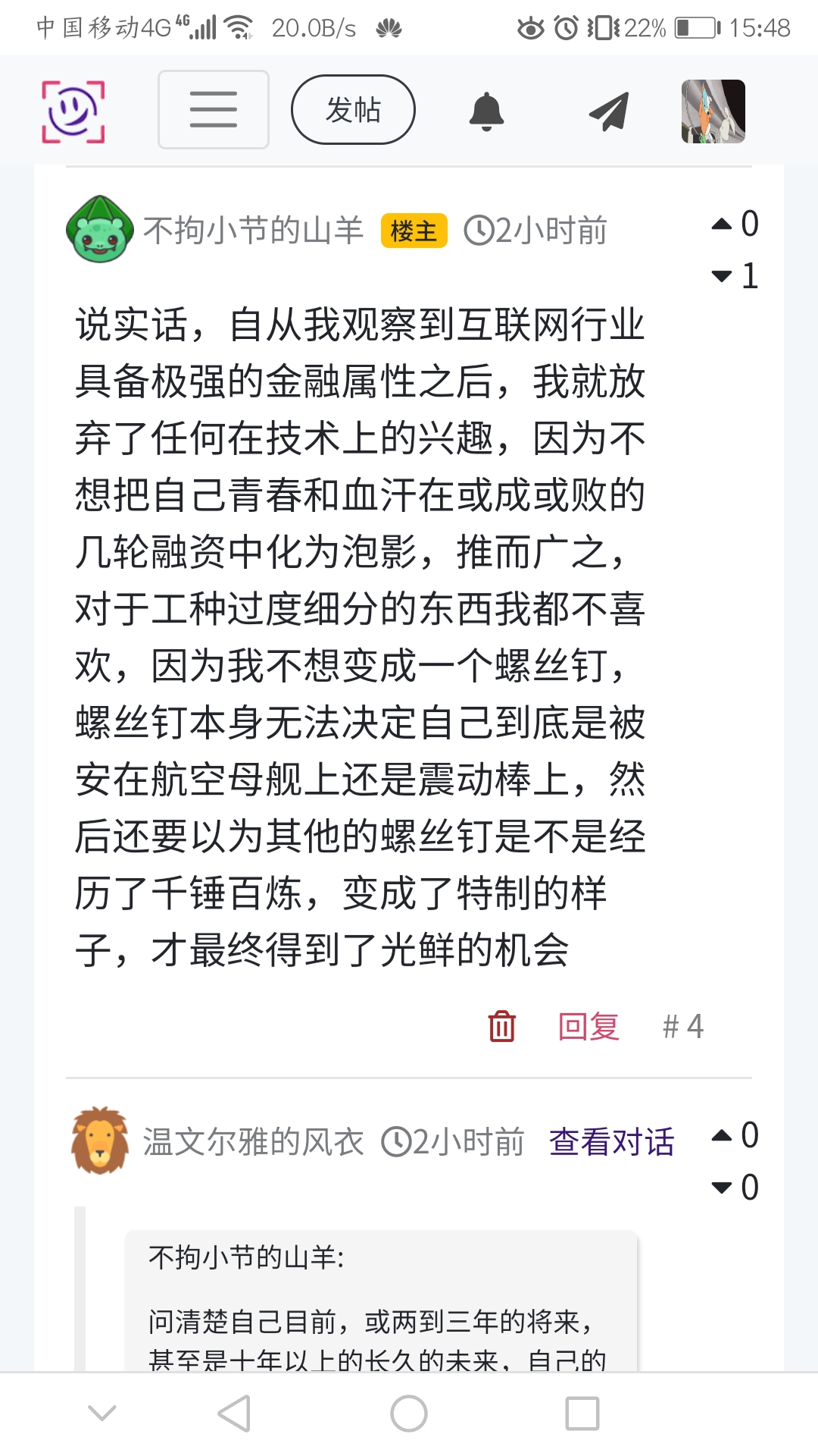 说实话,自从我观察到互联网行业具备极强的金融属性之后,我就放弃了任何在技术上的兴趣,因为不想把自己青春和血汗在或成或败的几轮融资中化为泡影,推而广之,对于工种过度细分的东西我都不喜欢,因为我不想变成一个螺丝钉,螺丝钉本身无法决定自己到底是被安在航空母舰上还是震动棒上,然后还要以为其他的螺丝钉是不是经历了千锤百炼,变成了特制的样子,才最终得到了光鲜的机会