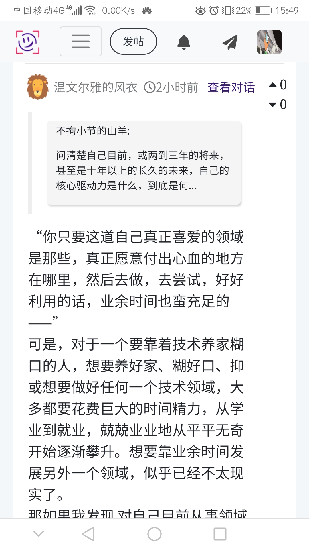 有人会说,那有些人就是没法分清楚自己在技术世界的一个定位与价值,怎么办?那其实也不影响,那就不要在这个技术世界里面打转,苦苦寻求跟技术的亲密接触了(此处应该有一首《届不到的恋》),跳出来,重新去发现你人生中最能打动你的是什么,这些领域可能很多,但从什么时候开始都不迟(当然你说你要靠着技术养家糊口,那没关系,你只要知道自己真正喜爱的领域是哪些,真正愿意付出心血的地方在哪里,然后去做,去尝试,好好利用的话,业余时间也蛮充足的)