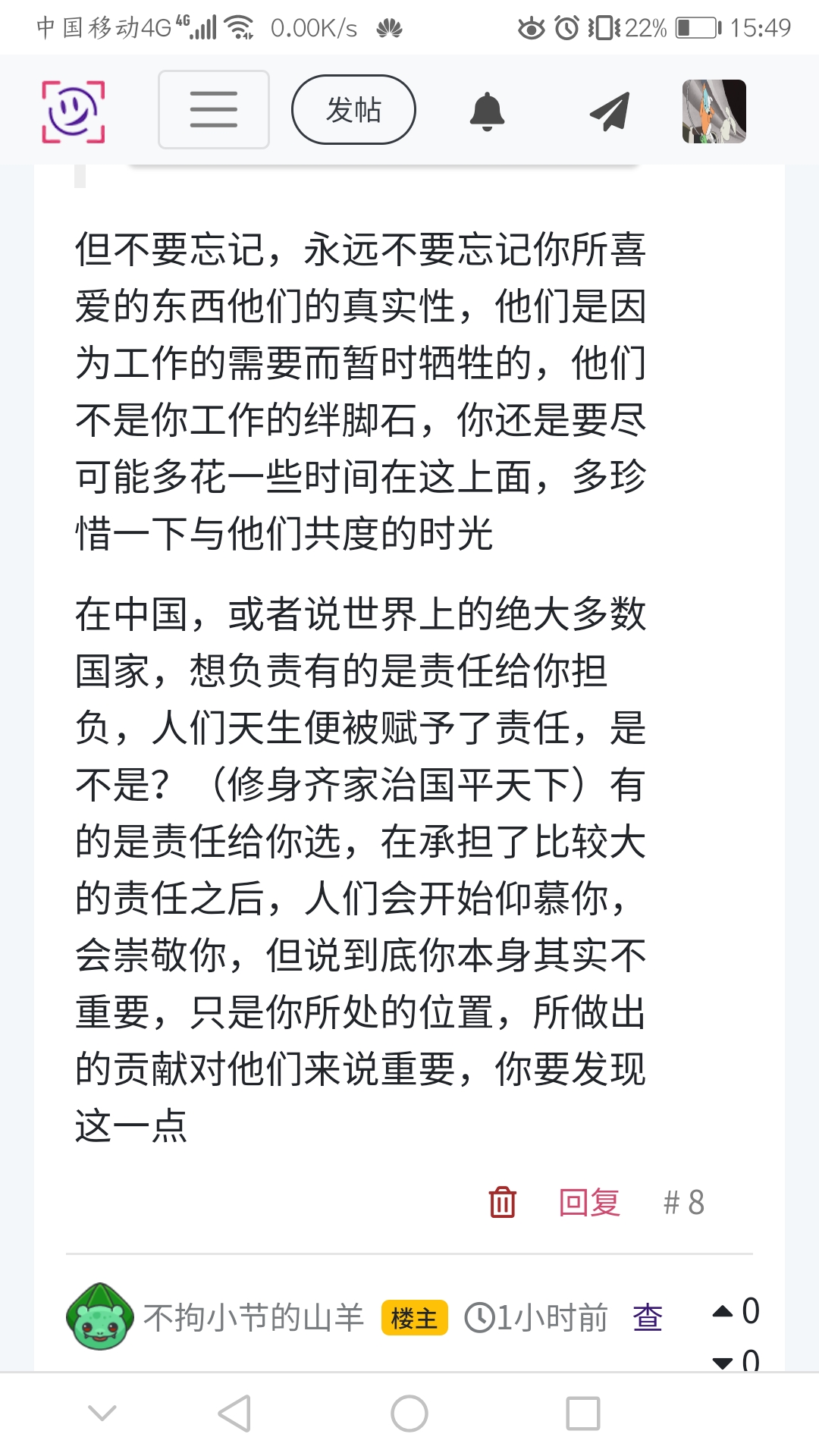 在中国,或者说世界上的绝大多数国家,想负责有的是责任给你担负,人们天生便被赋予了责任,是不是?(修身齐家治国平天下)有的是责任给你选,在承担了比较大的责任之后,人们会开始仰慕你,会崇敬你,但说到底你本身其实不重要,只是你所处的位置,所做出的贡献对他们来说重要,你要发现这一点