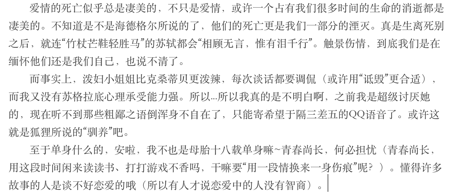 未读寥寥数句,骤觉毛骨悚然。倏地忆起《会饮篇》中阿伽通和苏格拉底将恋爱作为永生之法的幸福美满,再与文中将恋爱和死亡紧密相连的骨感嶙峋相比,倍感昏天黑地,难以接受。反复阅览,欲寻纰漏以辩驳之。却因一直思考死亡的奥秘,愈思愈乏味,倒是冷却了之前炽热翻腾的情感,丧失了对“泼妇”小姐姐的热切心意了(hhh)。