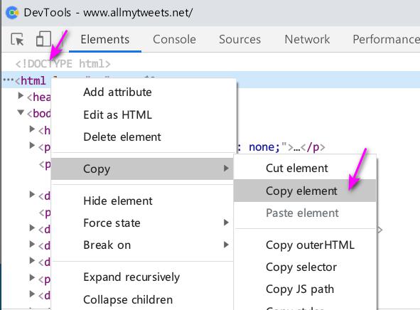 然后页面从头到尾拖动几下,确保完全加载(我这边量不大是可以一次加载好,太大了的话就得多拖几下) 然后按f12,在最上面那个<html>处右键,然后选择复制元素