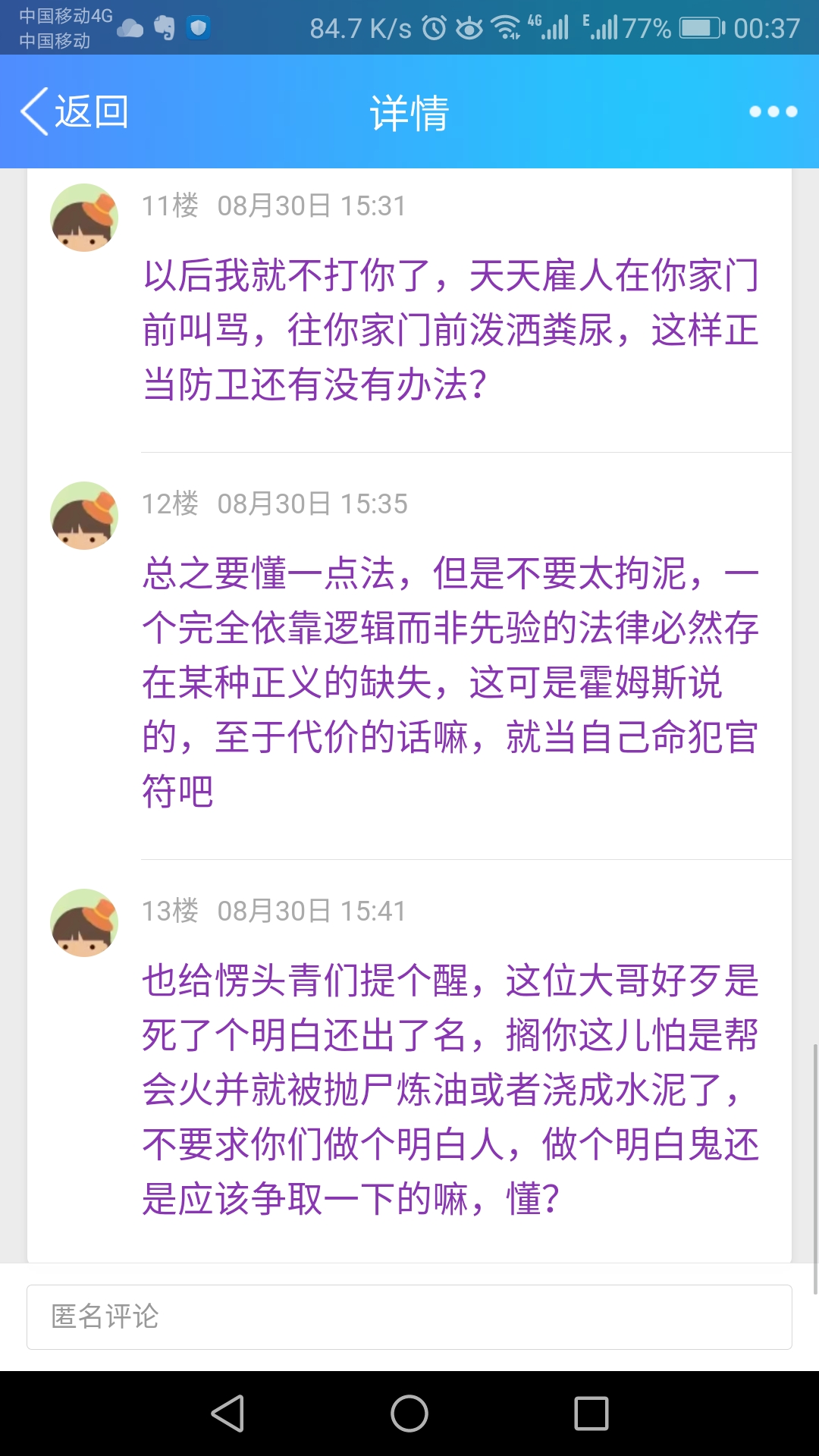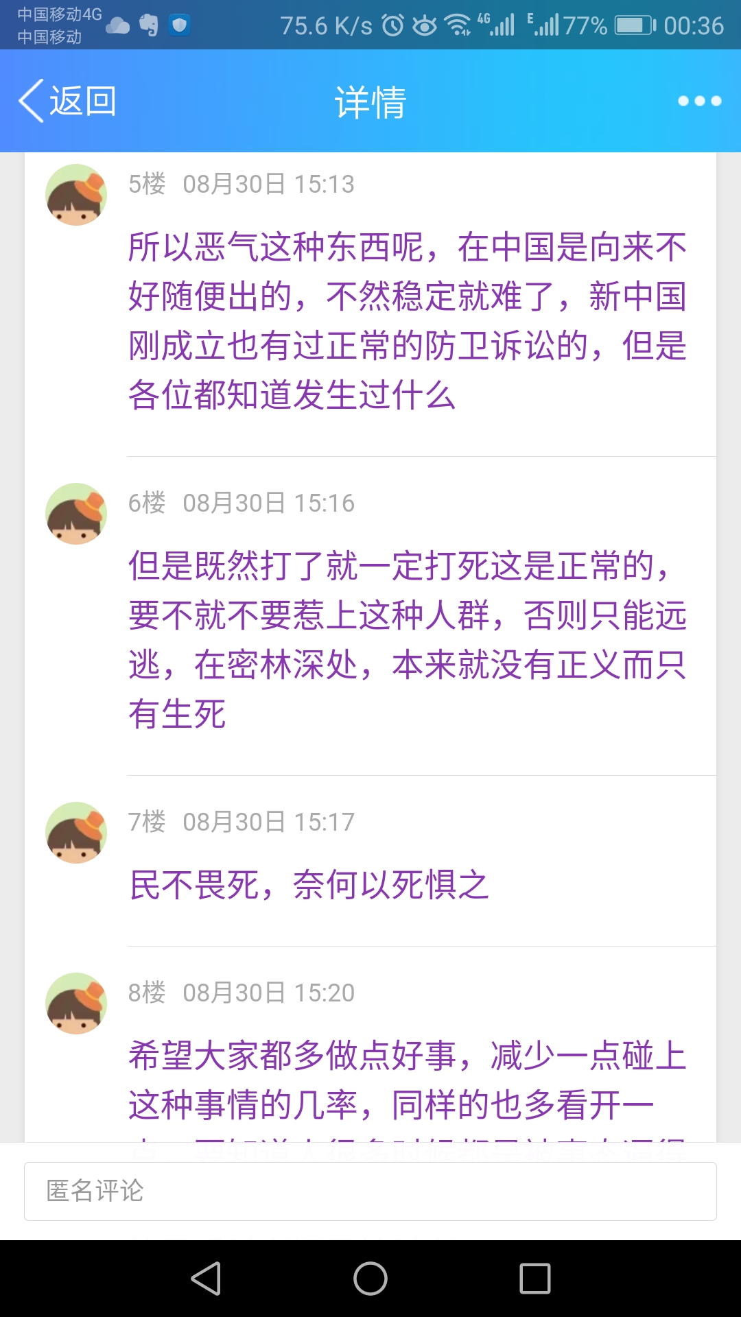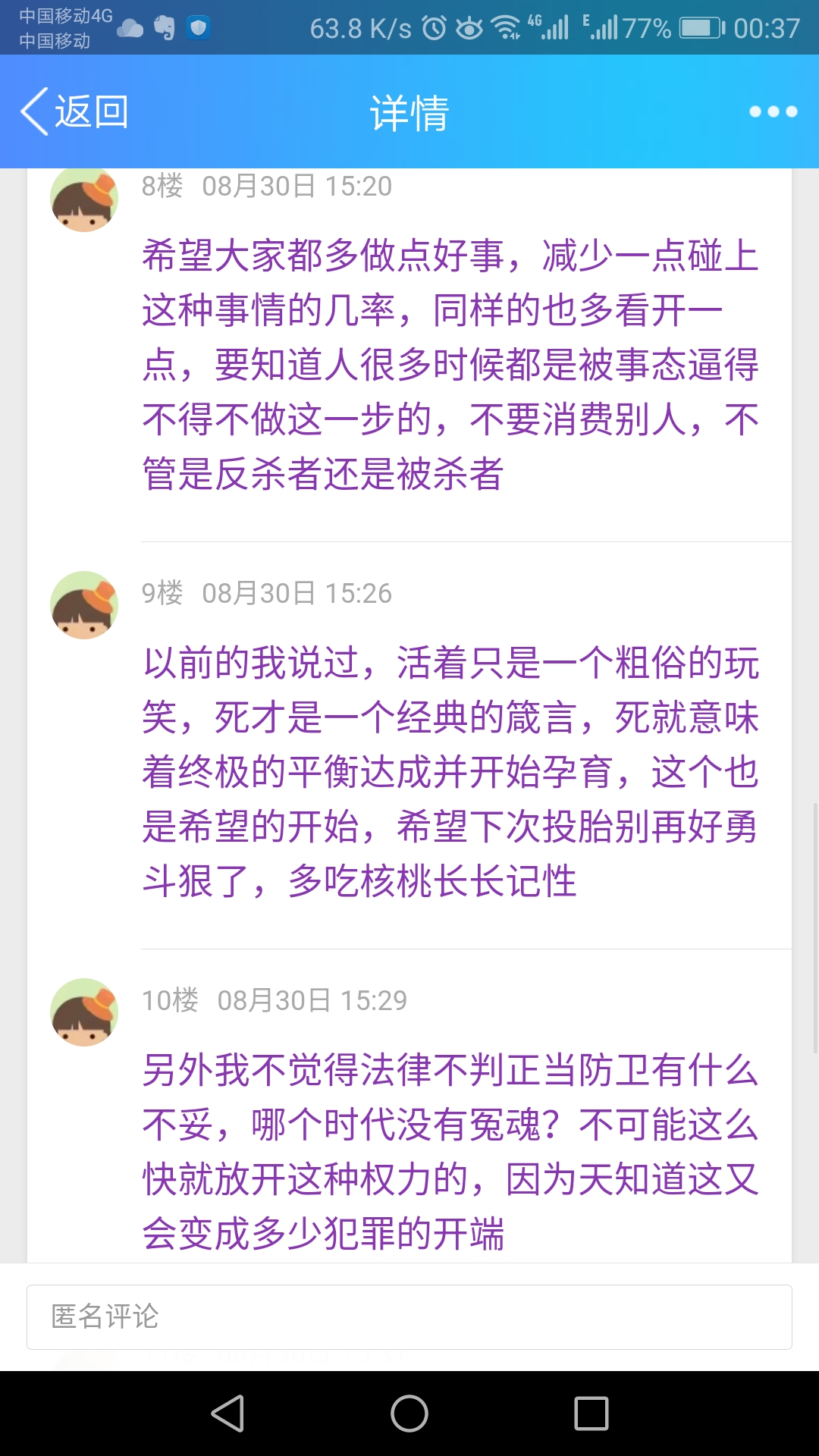 希望大家都多做点好事,减少一点碰上这种事情的几率,同样的也多看开一点,要知道人很多时候都是被事态逼得不得不做这一步的,不要消费别人,不管是反杀者还是被杀者