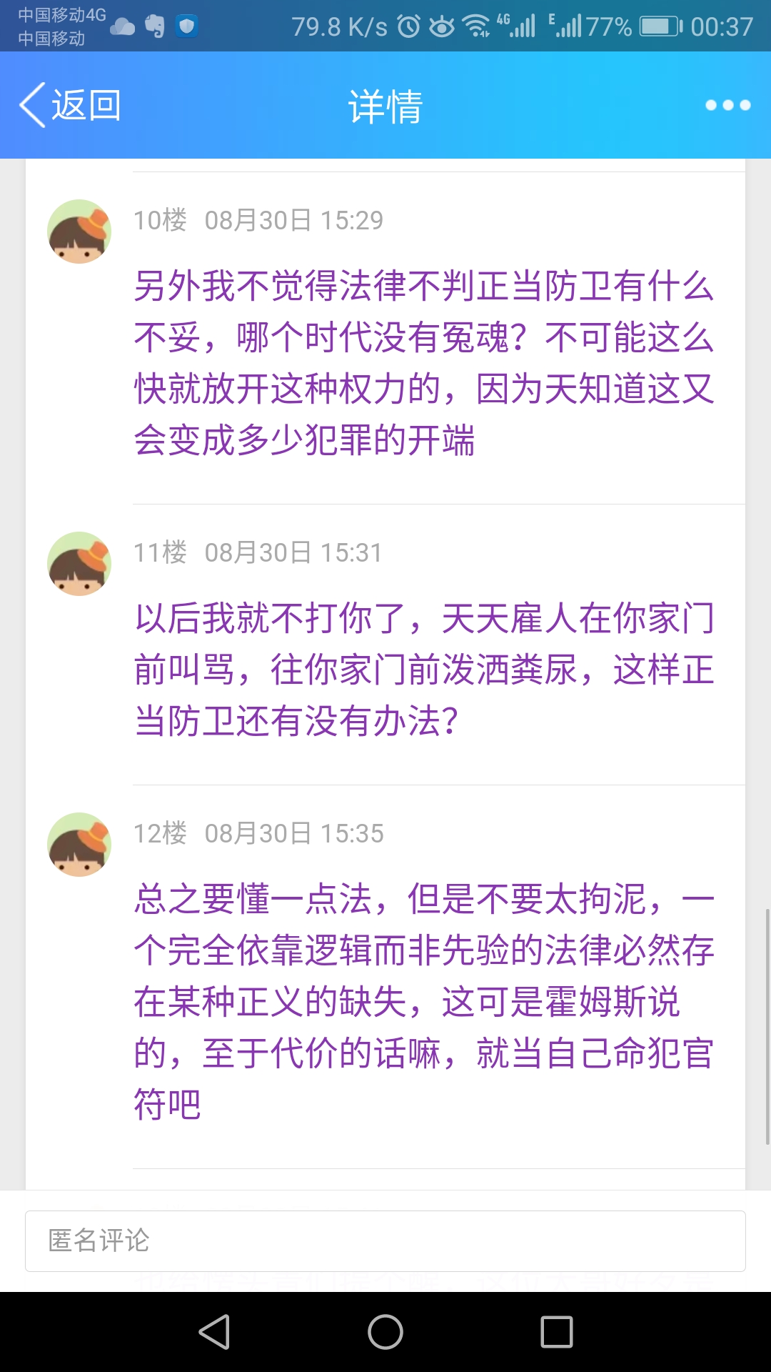 另外我不觉得法律不判正当防卫有什么不妥,哪个时代没有冤魂?不可能这么快就放开这种权力的,因为天知道这又会变成多少犯罪的开端