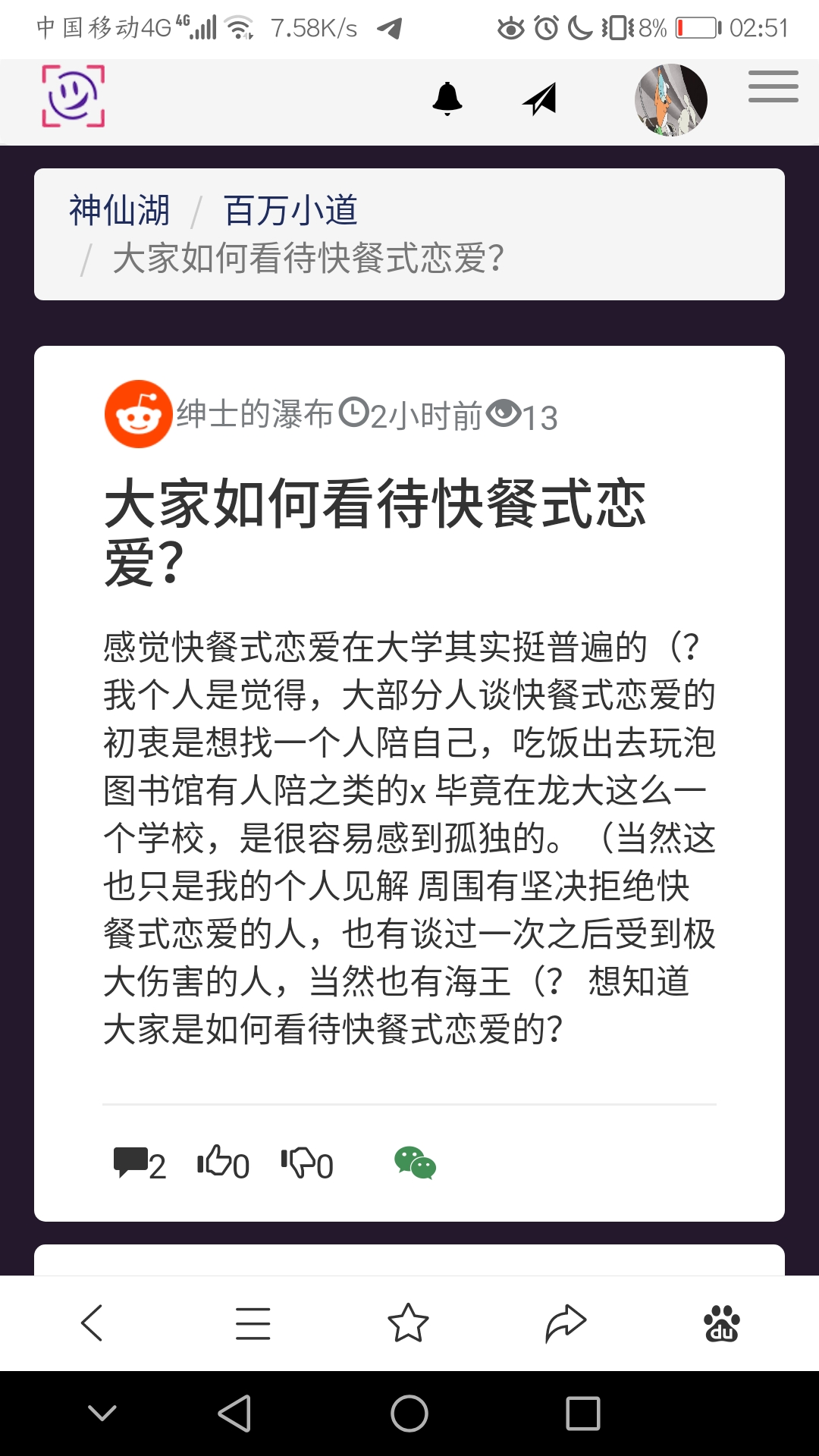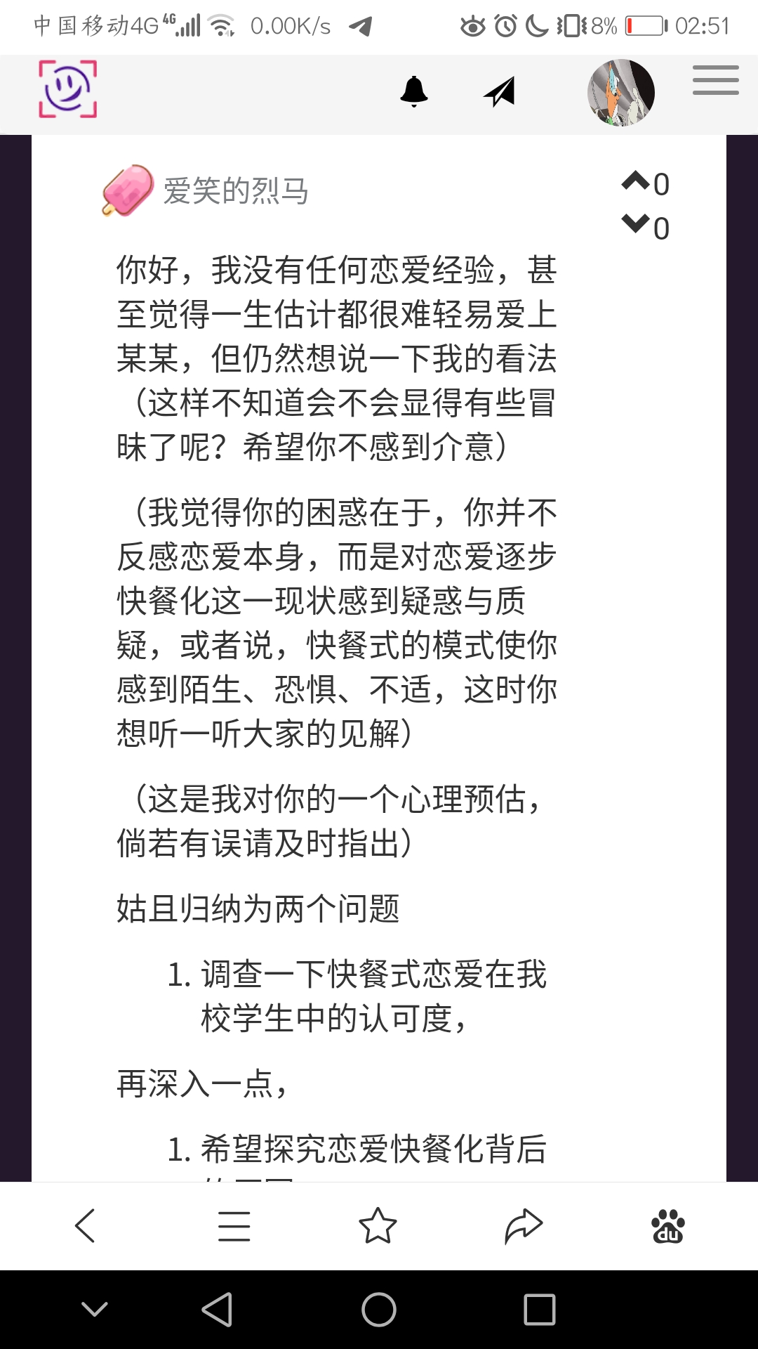 感觉快餐式恋爱在大学其实挺普遍的(?我个人是觉得,大部分人谈快餐式恋爱的初衷是想找一个人陪自己,吃饭出去玩泡图书馆有人陪之类的x 毕竟在龙大这么一个学校,是很容易感到孤独的。(当然这也只是我的个人见解 周围有坚决拒绝快餐式恋爱的人,也有谈过一次之后受到极大伤害的人,当然也有海王(? 想知道大家是如何看待快餐式恋爱的?