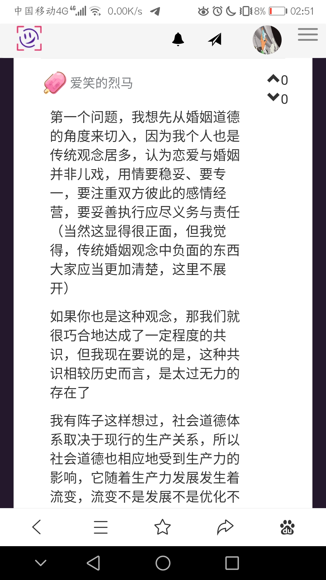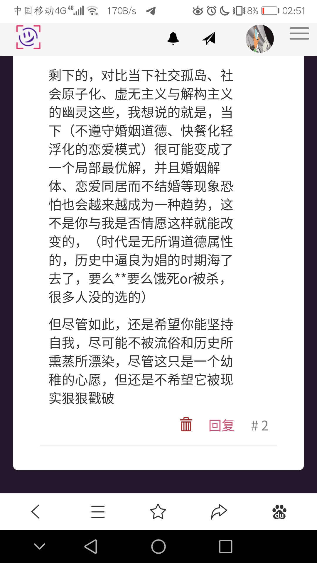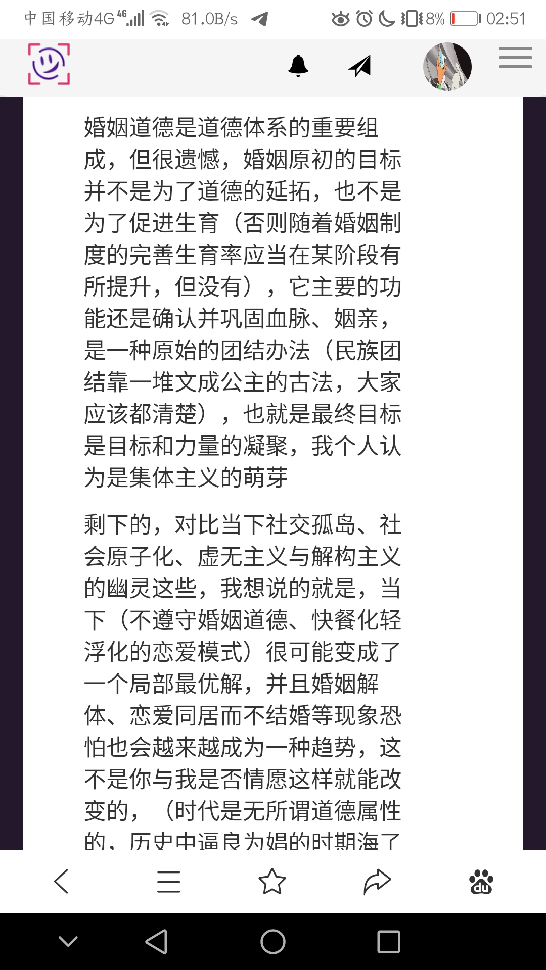 剩下的,对比当下社交孤岛、社会原子化、虚无主义与解构主义的幽灵这些,我想说的就是,当下(不遵守婚姻道德、快餐化轻浮化的恋爱模式)很可能变成了一个局部最优解,并且婚姻解体、恋爱同居而不结婚等现象恐怕也会越来越成为一种趋势,这不是你与我是否情愿这样就能改变的,(时代是无所谓道德属性的,历史中逼良为娼的时期海了去了,要么**要么饿死or被杀,很多人没的选的)
