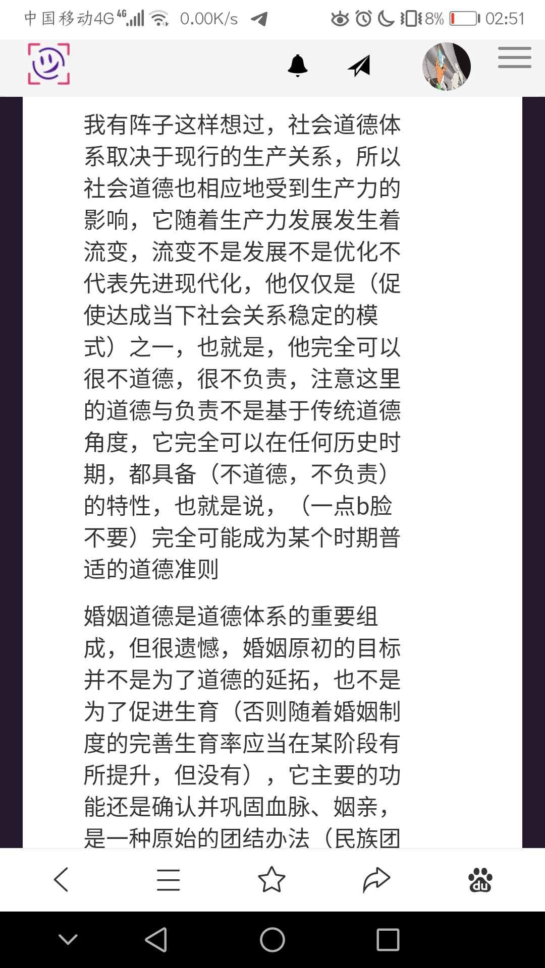 我有阵子这样想过,社会道德体系取决于现行的生产关系,所以社会道德也相应地受到生产力的影响,它随着生产力发展发生着流变,流变不是发展不是优化不代表先进现代化,他仅仅是(促使达成当下社会关系稳定的模式)之一,也就是,他完全可以很不道德,很不负责,注意这里的道德与负责不是基于传统道德角度,它完全可以在任何历史时期,都具备(不道德,不负责)的特性,也就是说,(一点b脸不要)完全可能成为某个时期普适的道德准则