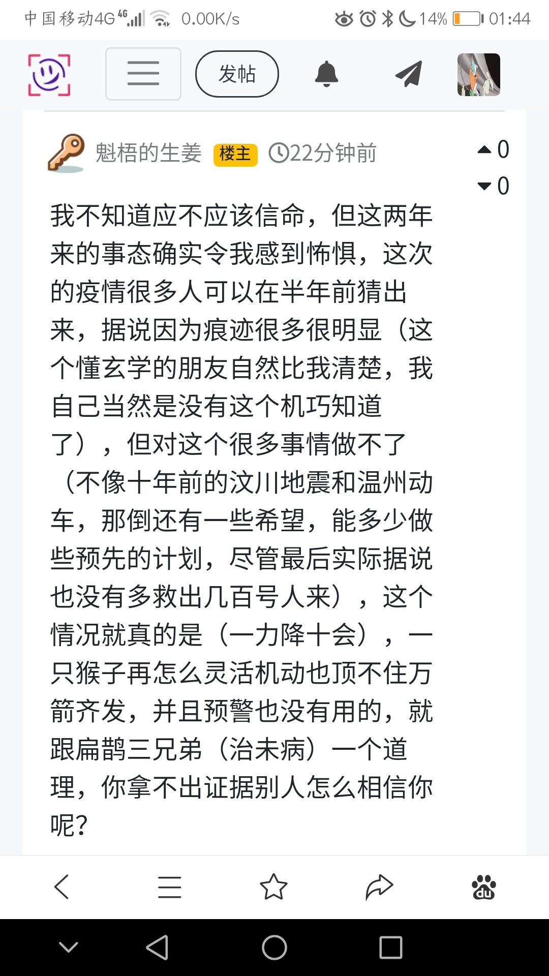 我不知道应不应该信命,但这两年来的事态确实令我感到怖惧,这次的疫情很多人可以在半年前猜出来,据说因为痕迹很多很明显(这个懂玄学的朋友自然比我清楚,我自己当然是没有这个机巧知道了),但对这个很多事情做不了(不像十年前的汶川地震和温州动车,那倒还有一些希望,能多少做些预先的计划,尽管最后实际据说也没有多救出几百号人来),这个情况就真的是(一力降十会),一只猴子再怎么灵活机动也顶不住万箭齐发,并且预警也没有用的,就跟扁鹊三兄弟(治未病)一个道理,你拿不出证据别人怎么相信你呢?