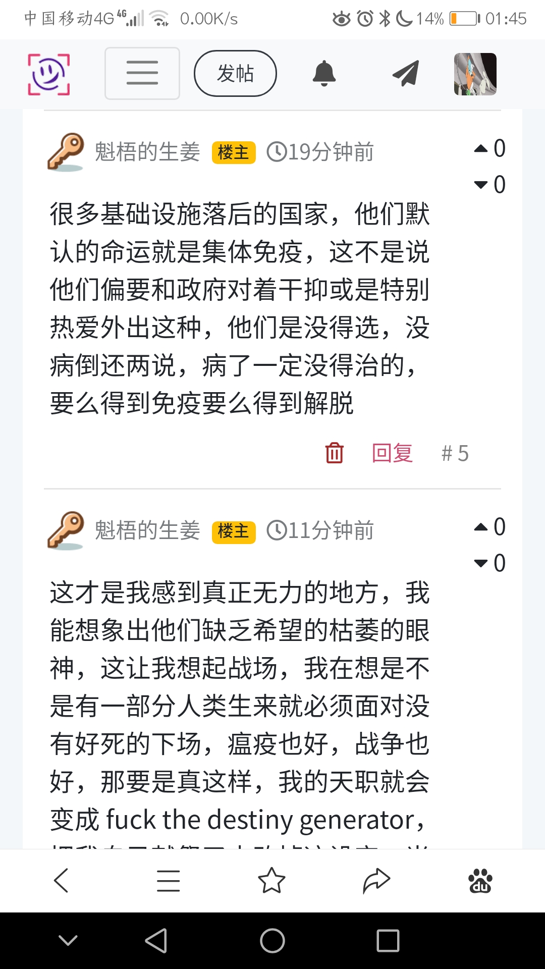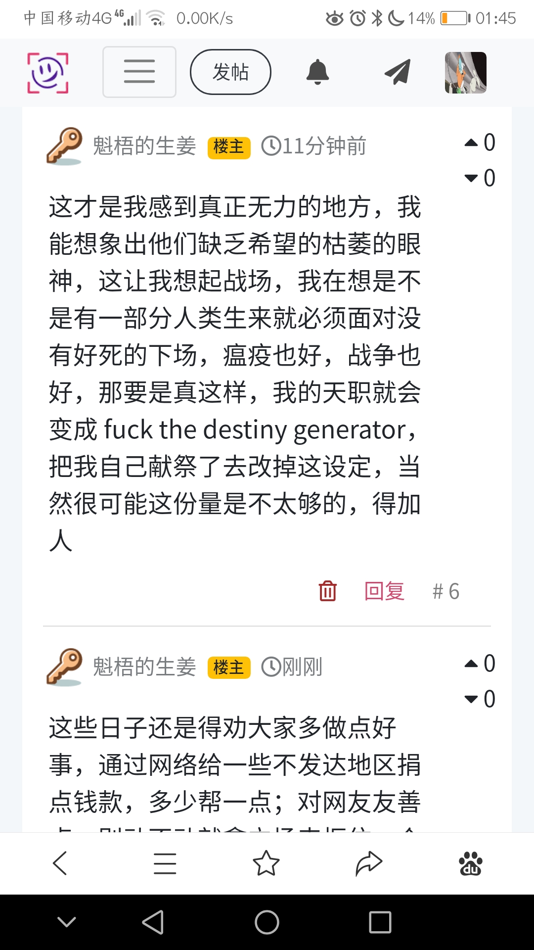 这才是我感到真正无力的地方,我能想象出他们缺乏希望的枯萎的眼神,这让我想起战场,我在想是不是有一部分人类生来就必须面对没有好死的下场,瘟疫也好,战争也好,那要是真这样,我的天职就会变成 fuck the destiny generator,把我自己献祭了去改掉这设定,当然很可能这份量是不太够的,得加人
