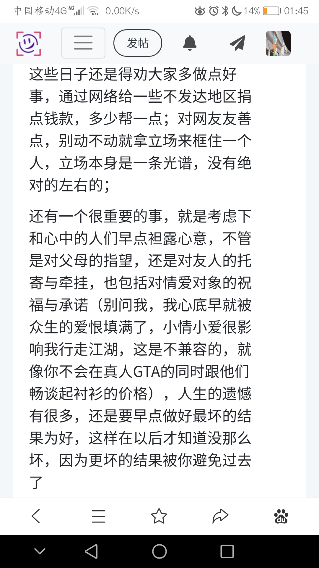 这些日子还是得劝大家多做点好事,通过网络给一些不发达地区捐点钱款,多少帮一点;对网友友善点,别动不动就拿立场来框住一个人,立场本身是一条光谱,没有绝对的左右的;