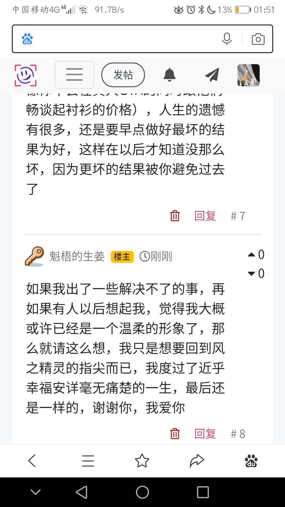 如果我出了一些解决不了的事,再如果有人以后想起我,觉得我大概或许已经是一个温柔的形象了,那么就请这么想,我只是想要回到风之精灵的指尖而已,我度过了近乎幸福安详毫无痛楚的一生,最后还是一样的,谢谢你,我爱你
